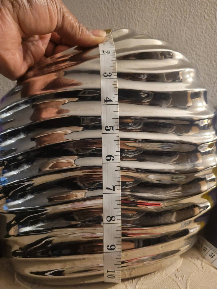 🌞Selling a decorative silver vase. 🌞It measures approximately 10 n half inches in height and same measurements in width. 🌞 It's a beautiful piece to add to your home decor!
