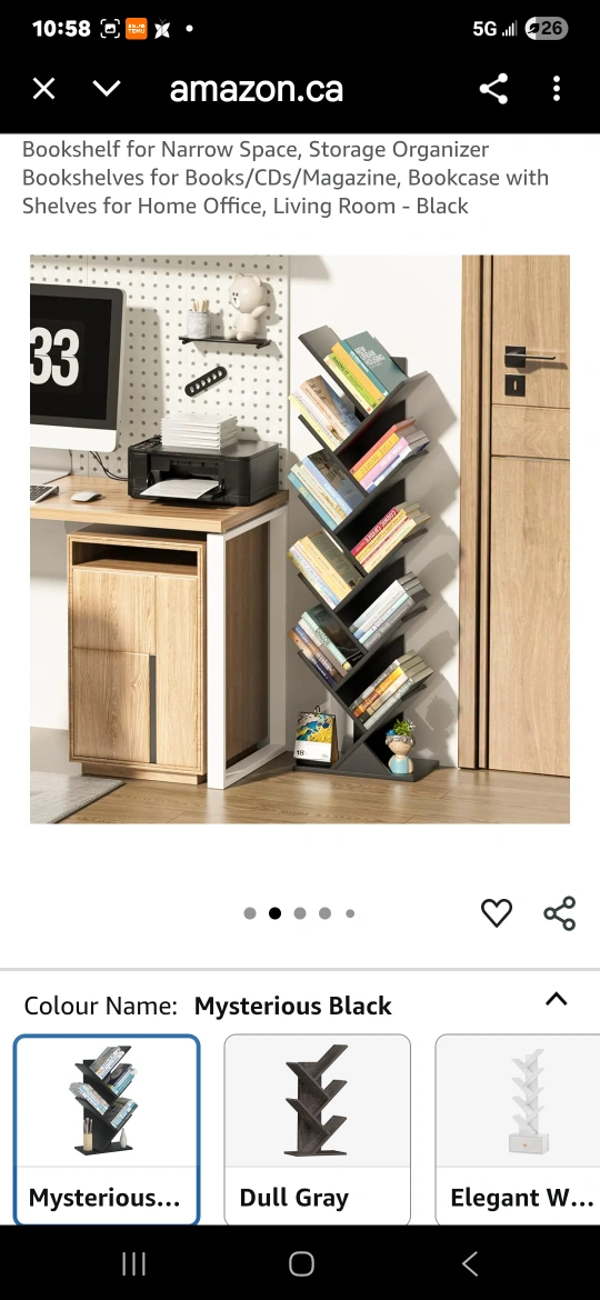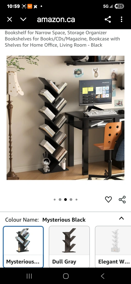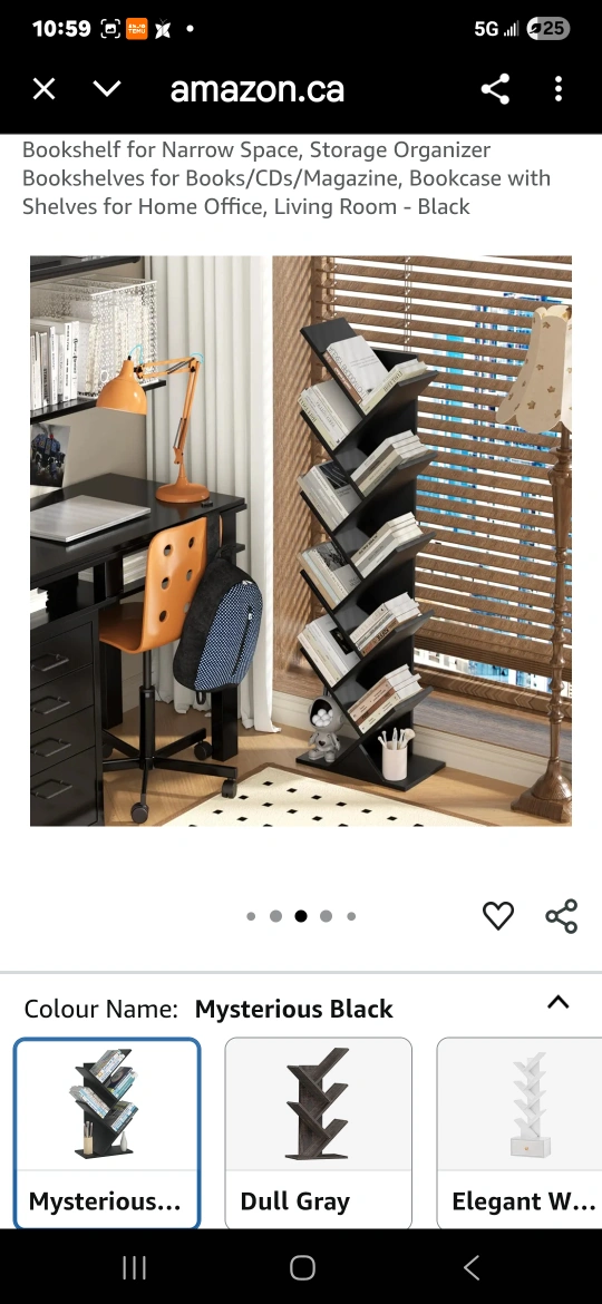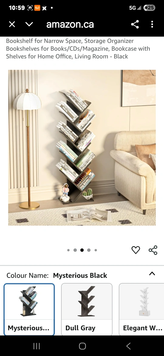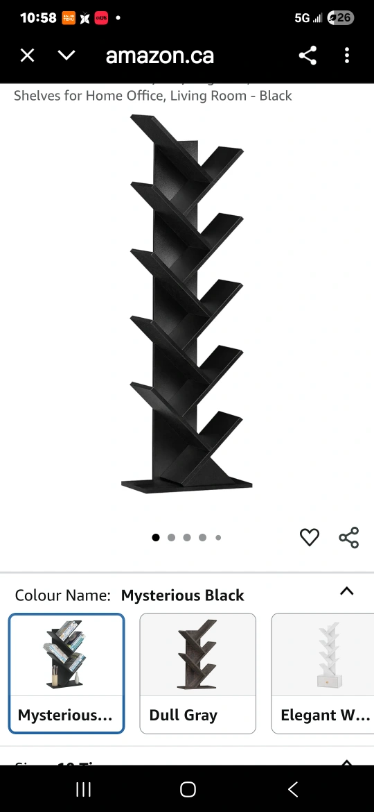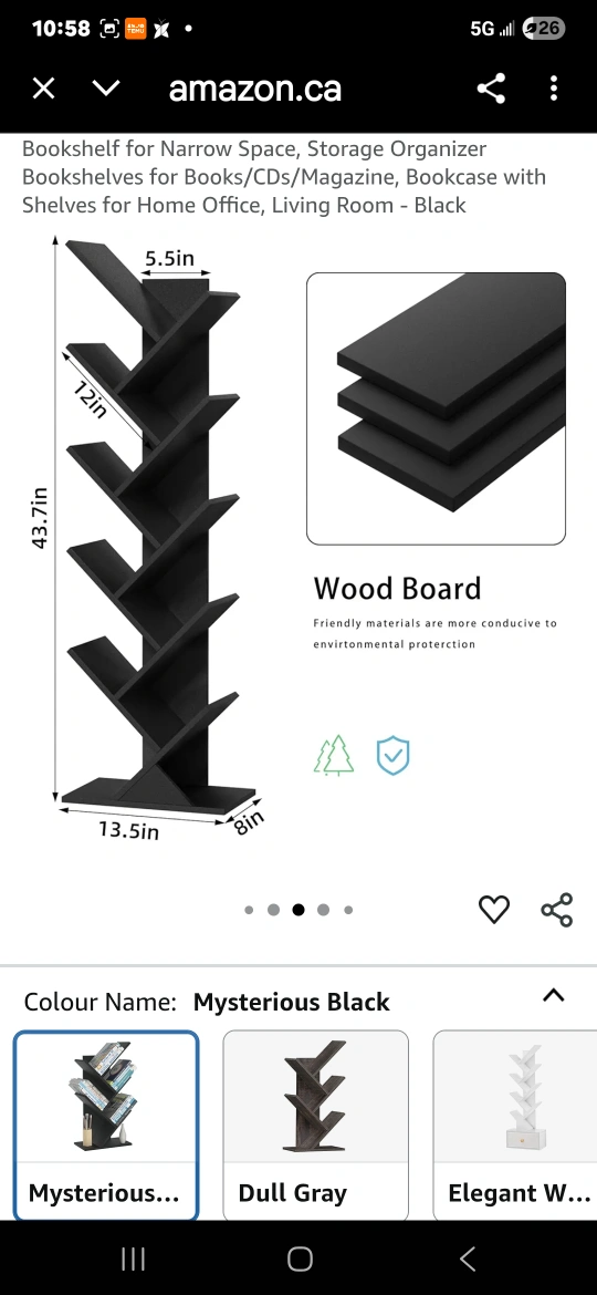 Looking to add a unique touch to your space? Check out this SHEEPAM 10 Tier Tree Bookshelf! It's perfect for narrow spaces and organizing your books, CDs, or magazines. The colour is 'Mysterious Black'. Dimensions: - Height: 43.7 inches - Shelf Depth: 5.5 inches - Base Width: 13.5 inches - Shelf Width: 12 inches Easy to pick up the books!