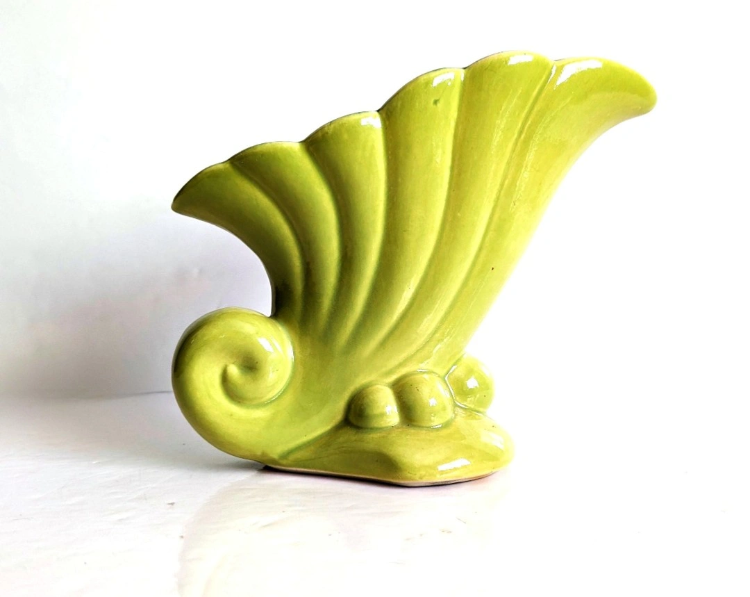 Classic Beauceware pottery. Segmented cornucopia vase. Very kitschy cool. The exterior is avocado green, and the interior is much deeper shade of green. Measures approximately 6.5 inches in height and 9 x 3.5 inches in diameter. Good vintage condition. Fabulous MCM charm. π PICK UP TOWNLINE HWY 2 AREA π CASH is preferred please π Thanks for looking π©΅
