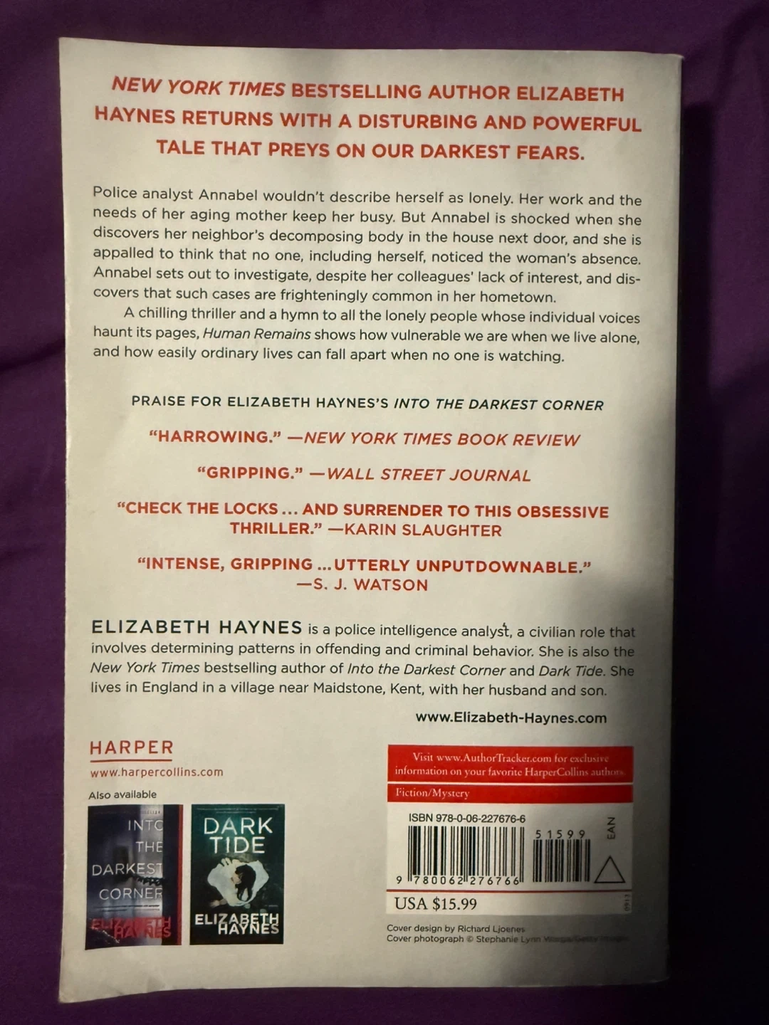 Selling the novel Human Remains by Elizabeth Haynes! It's a gripping thriller that explores dark themes. Perfect for anyone who enjoys suspenseful reads and compelling characters. Check it out! Open to trades