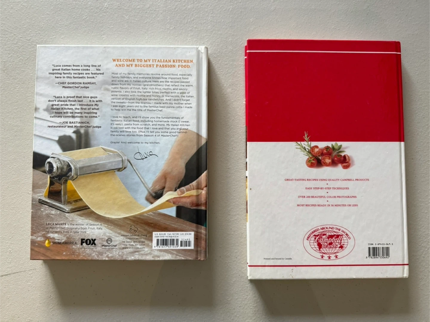 Selling a set of two cookbooks! One is "My Italian Kitchen" by Luca Manfe, featuring his favourite family recipes. The other is "Campbell's Quick and Easy Recipes", perfect for meals in 30 minutes or less. Both books are in great shape and ready to inspire some delicious cooking