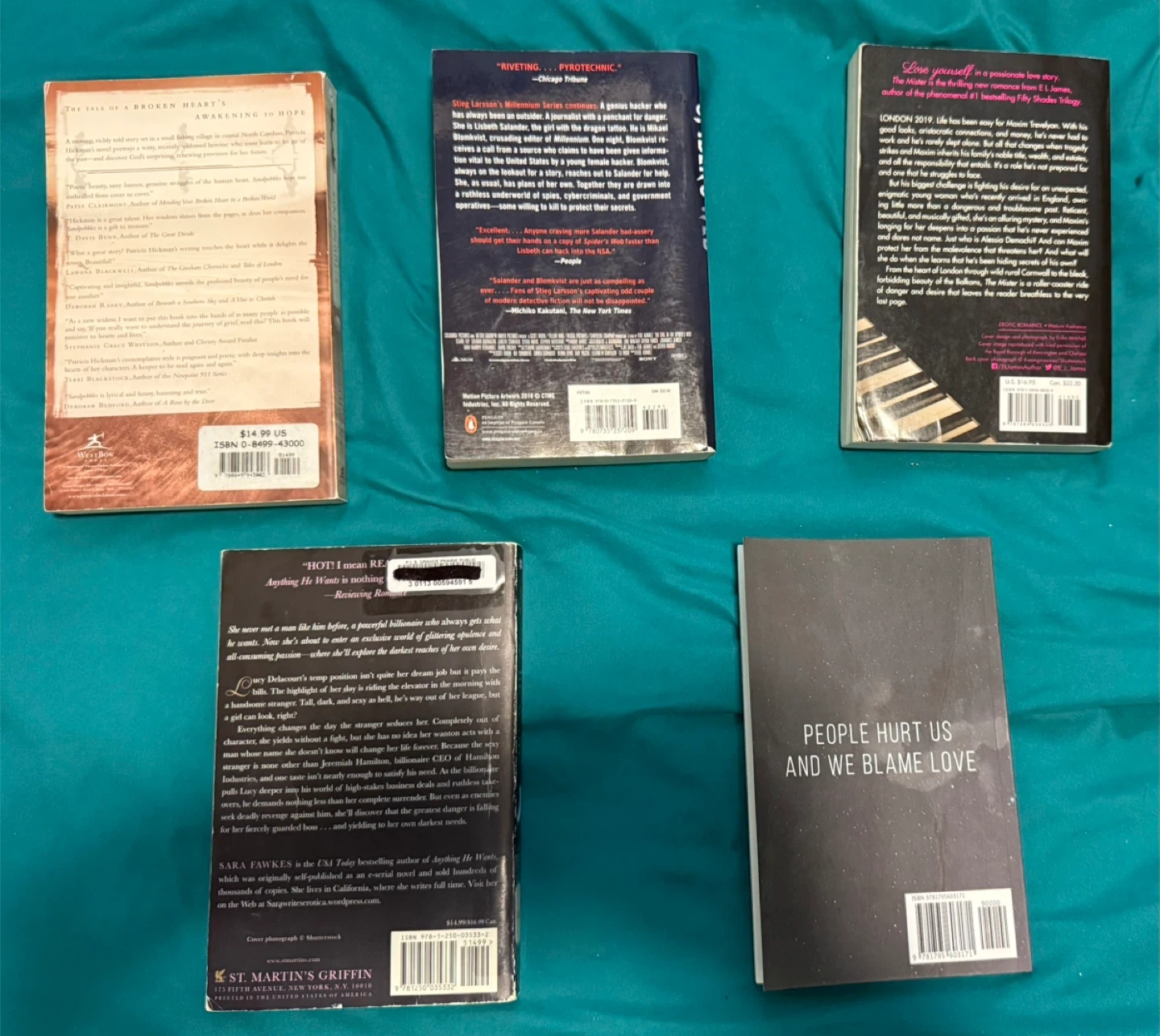 Selling a set of five assorted novels! Perfect for anyone looking for a variety of reads. The titles include: - Sandpebbles by Patricia Hickman - The Girl in the Spider's Web by David Lagercrantz - The Mister by E.L. James - Anything He Wants by Sara Fawkes - Dear Midnight by Zack Grey take them all for 6$ Open to trades