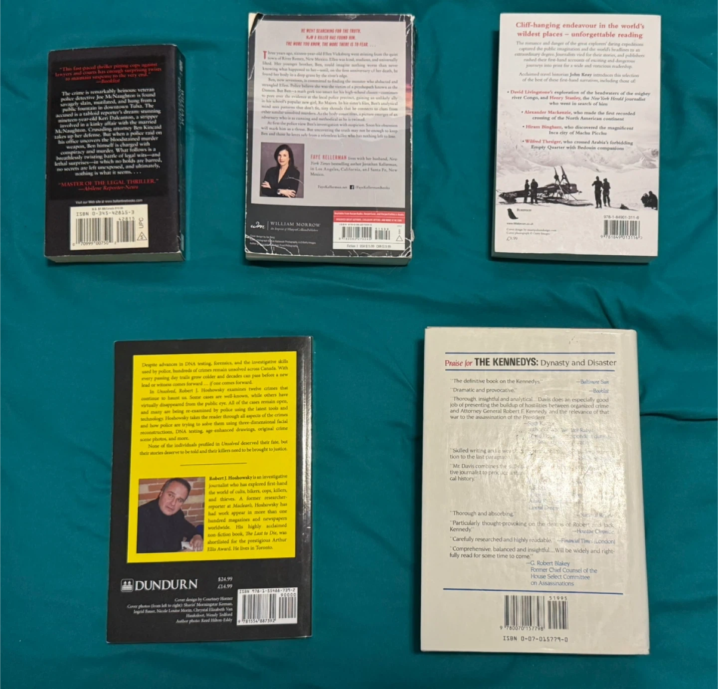 Selling a collection of used books including: - Murder One by William Bernhardt - Killing Season - The Mammoth Book of Travel in Dangerous Places - Mafia Kingfish by John H. Davis - Unsolved: True Canadian Cold Cases by Robert J. Hoshowsky take all 5 books for 5$