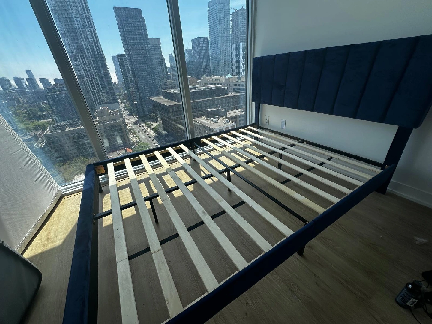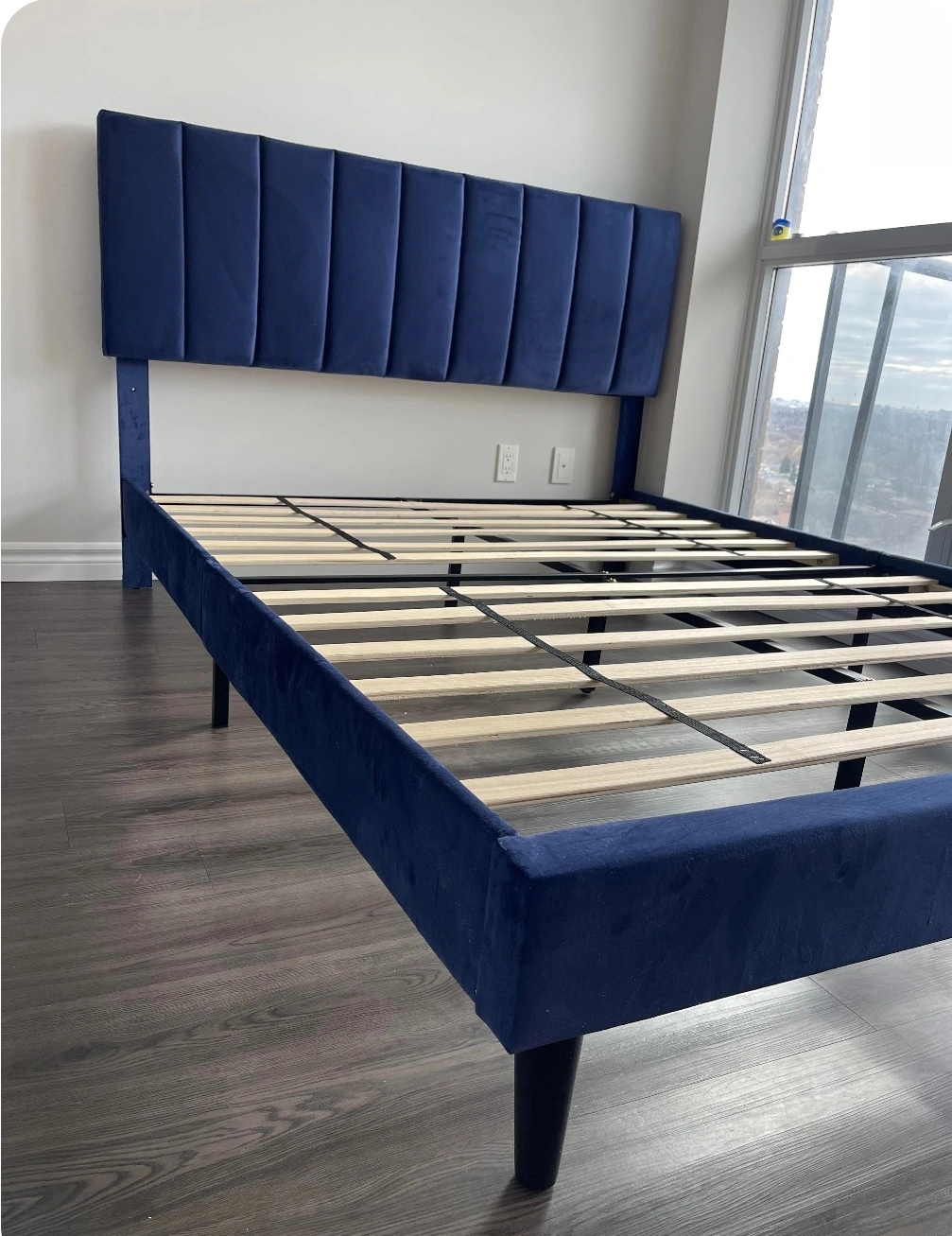 Selling a stylish blue velvet platform bed frame. It's in great condition and ready to add a touch of elegance to your bedroom. The platform design eliminates the need for a box spring, providing a sleek and modern look