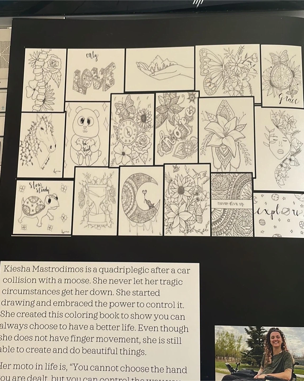 Selling a brand new colouring book titled 'Fall Down Seven Times, Stand Up Eight'. It features beautiful illustrations ready for your artistic touch. Perfect for relaxation and creative expression volume one of my self published and self drawn colouring book! I was in a car accident with a moose when I was 17 and I broke my neck and ended up in a wheelchair. I lost the use of my fingers and full control of my hands, but taught myself how to draw and created this book!