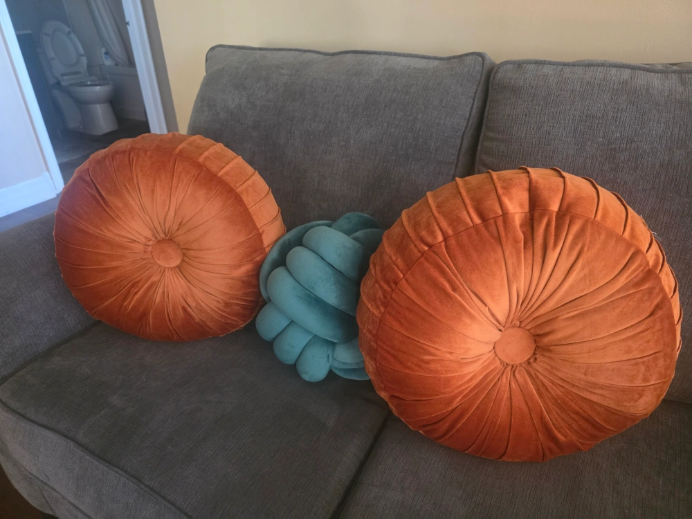 Selling a set of two round velvet throw pillows. They're a lovely burnt orange colour and in great condition. They would be perfect for adding a pop of colour and texture to your living room or bedroom! Also including a blue decorative knot pillow.