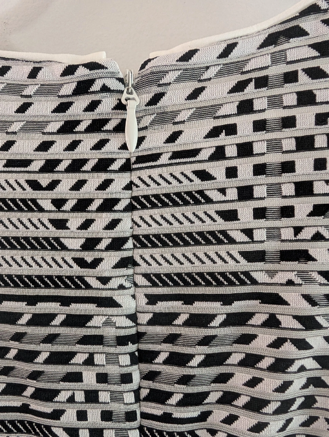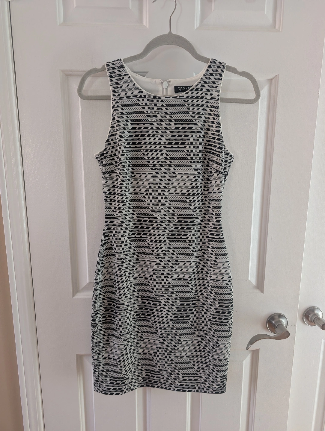 Selling a Guess sleeveless dress in size 2. It has a unique black and white geometric pattern. Perfect for a night out or a special occasion!