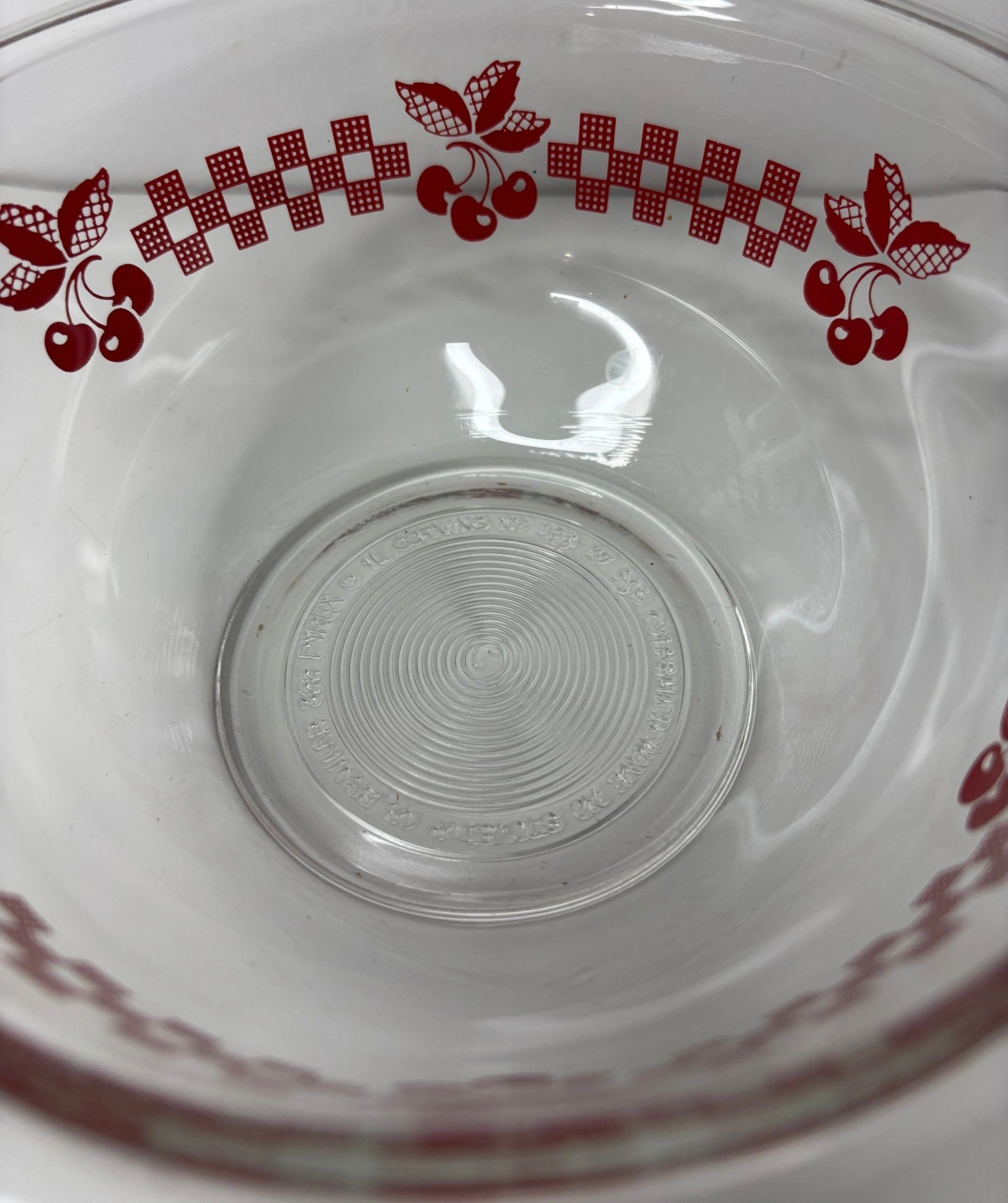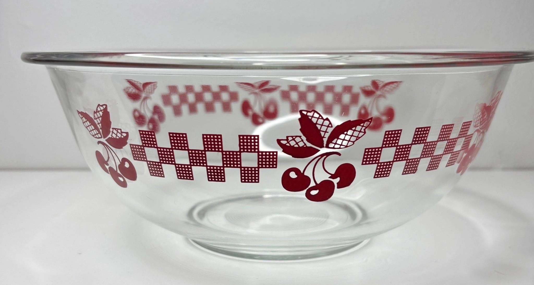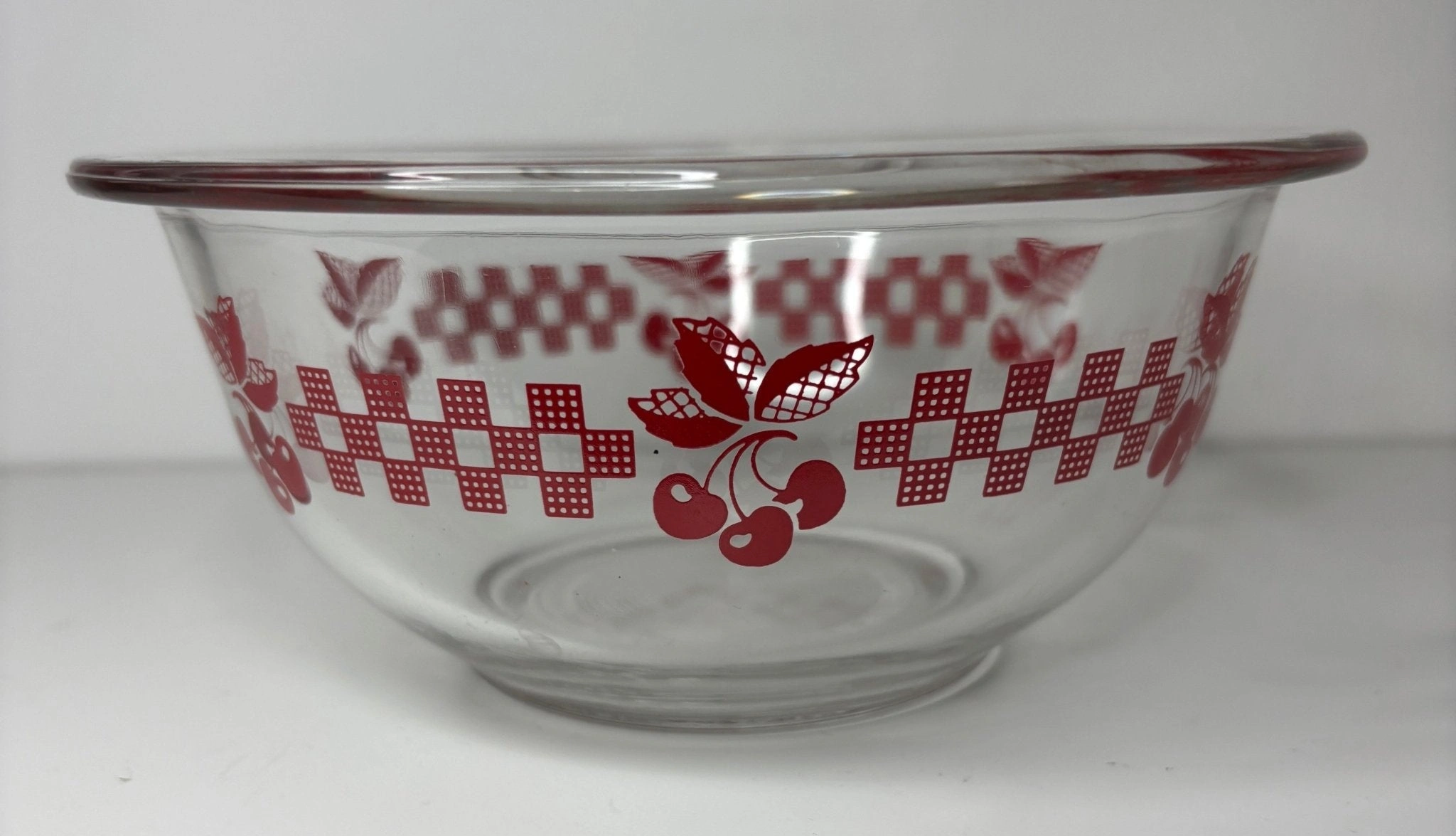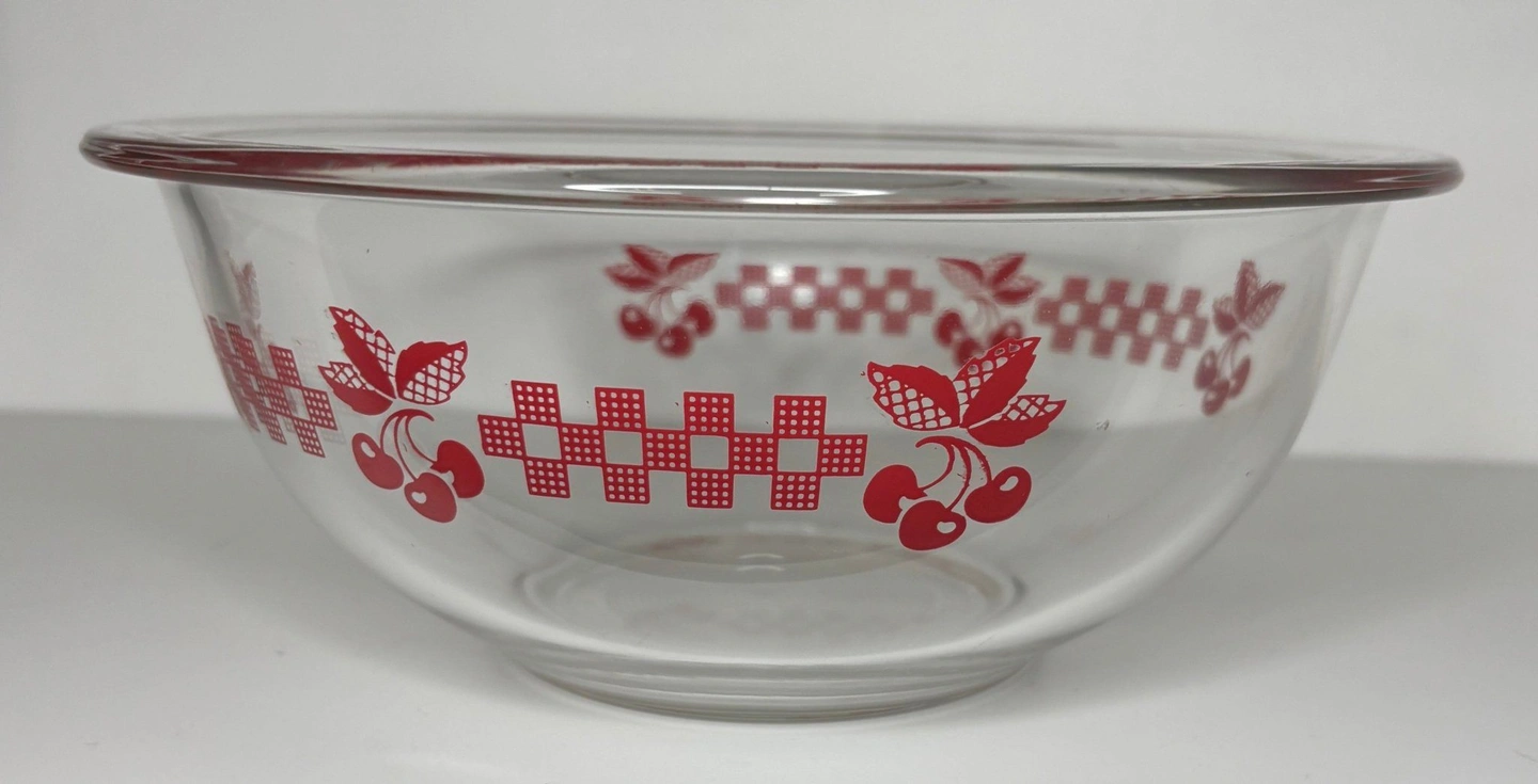The Pyrex Cherry Design Glass Nesting Mixing Bowls will add a healthy does of color, style, charm, and function to your kitchen. These vintage inspired bowls capture the beauty of classic Pyrex with a cheerful red cherry pattern and durable clear glass body. Made from tempered glass, they offer strength, a clean look, and resistance to stains and odors. The sizes make these bowl great for mixing batter, tossing salads, or preparing dough. A flared rim adds a great design feature that allows for easier handling while whipping up your favorite recipe or serving a thoughtful, home cooked meal. The classic nesting design saves space and pairs beautifully with other Pyrex cherry pattern bowls. The Pyrex cherry pattern is valued by collectors and cooks alike for its nostalgic appeal and vintage craftsmanship. Home bakers love its functionality and versatility in helping create great food offerings. These Pyrex cherry themed bowls are great if you are starting your vintage Pyrex collection or completing your existing set. They add beauty and practicality to your kitchen. Own a piece of Pyrex history that combines style, strength, and everyday usefulness with these Pyrex Cherry Design glass Nesting Mixing Bowls. Local pickup is in Etobicoke near Islington and The Westway. We offer shipping and local delivery for this item. Please send a message about availability and cost associated with these respective services. 7 inch - $35 8 inch - $40 10 inch - $45 Full set - $110