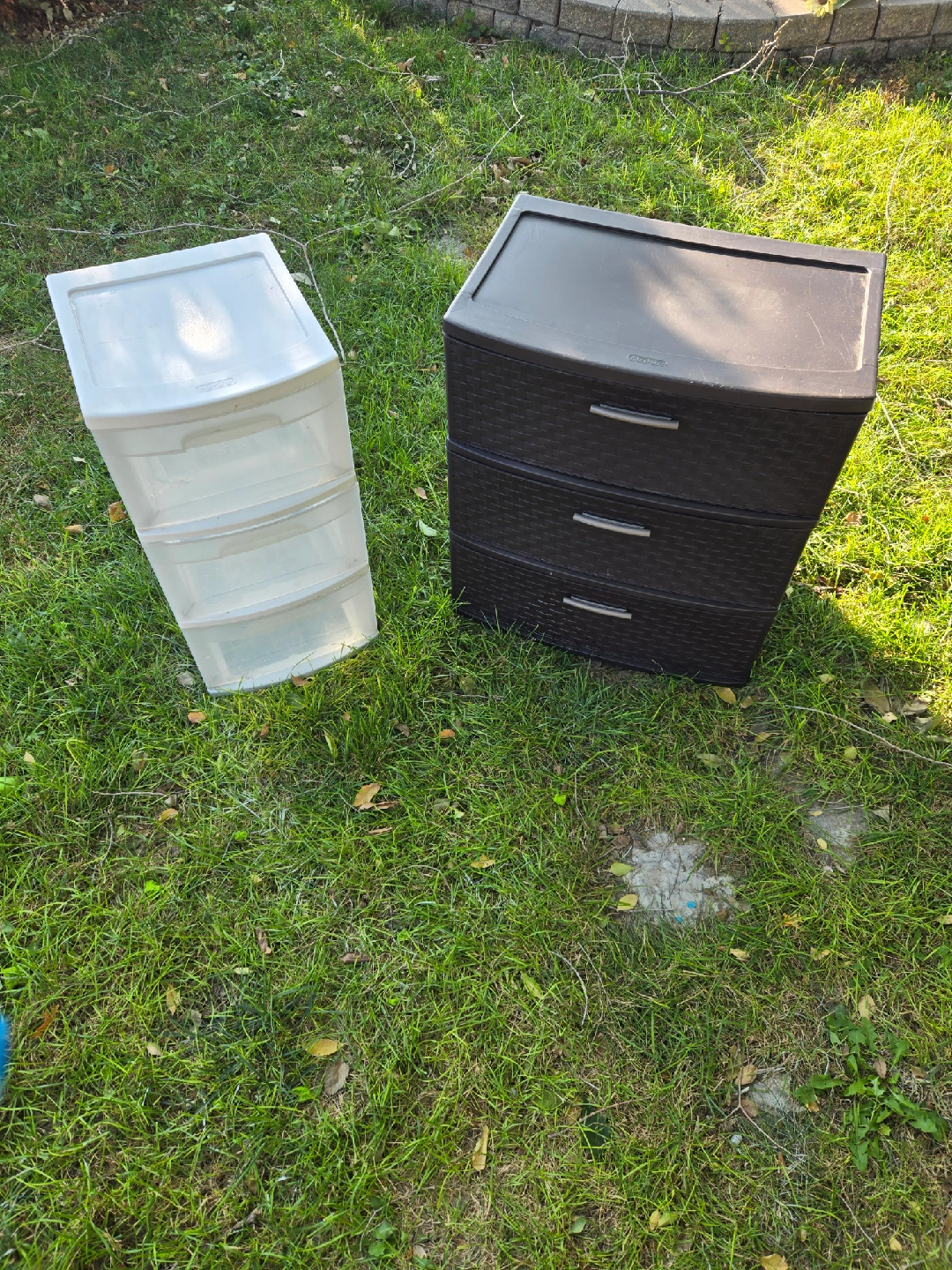 I have two Sterilite 3-drawer storage towers for sale! One is white with clear drawers, and the other is a dark brown colour with a woven texture. These are great for organizing small spaces! large one measures 22 by 15 by 23 1/2 height in inches both for $30