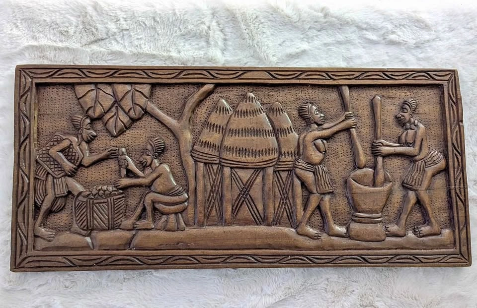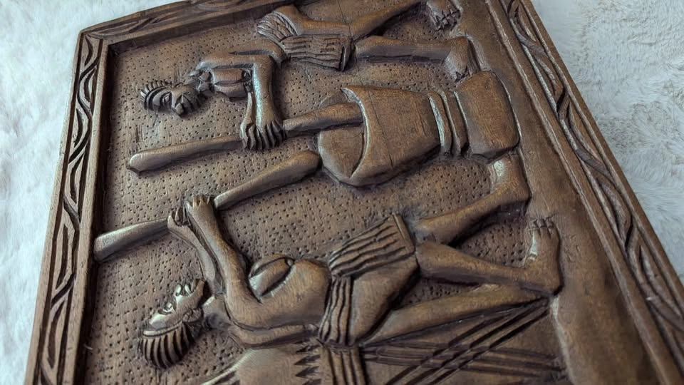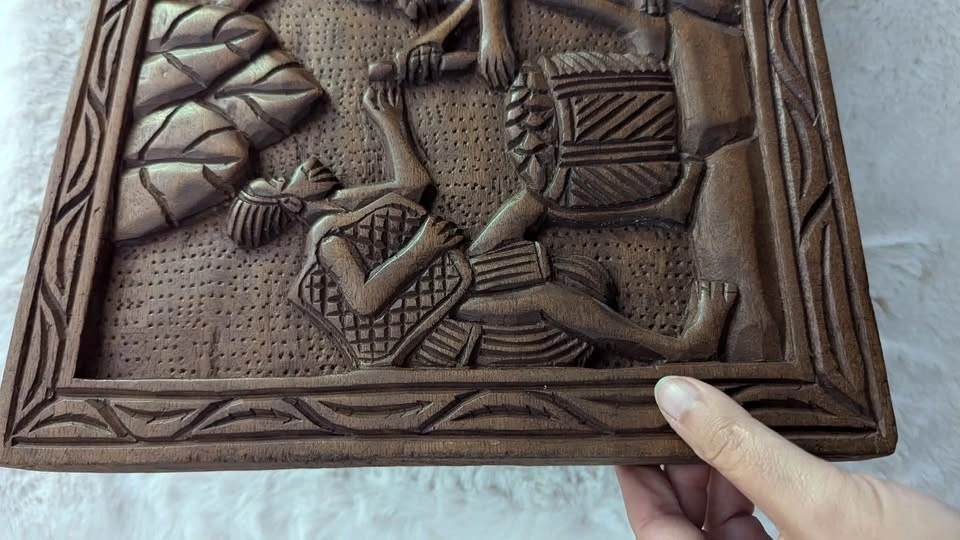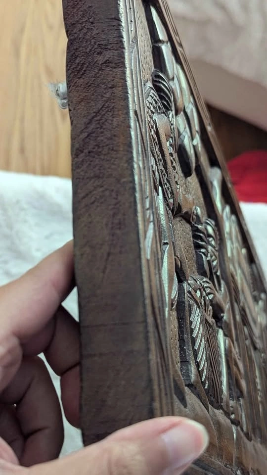 Crafted from solid wood with intricate relief carving and a decorative border. Unsigned, artist unknown. Excellent vintage condition