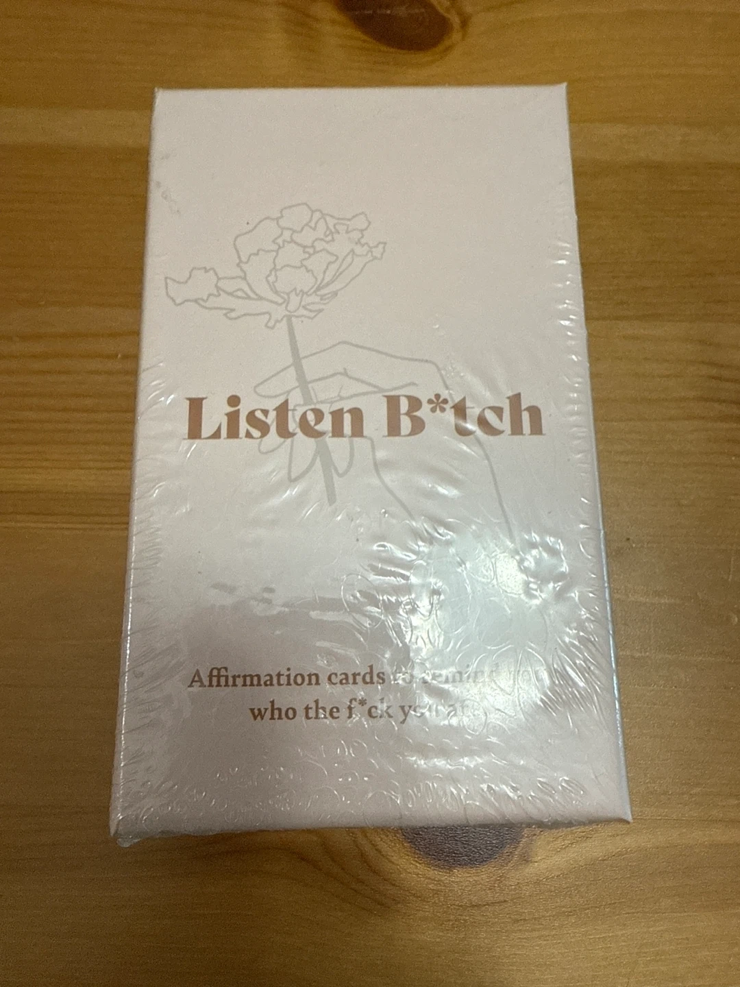I'm selling a brand new, sealed deck of 'Listen B*tch' affirmation cards! This deck contains 50 cards designed to provide uplifting messages and reminders of self-worth. Perfect for a little daily encouragement!