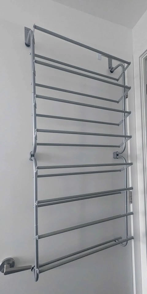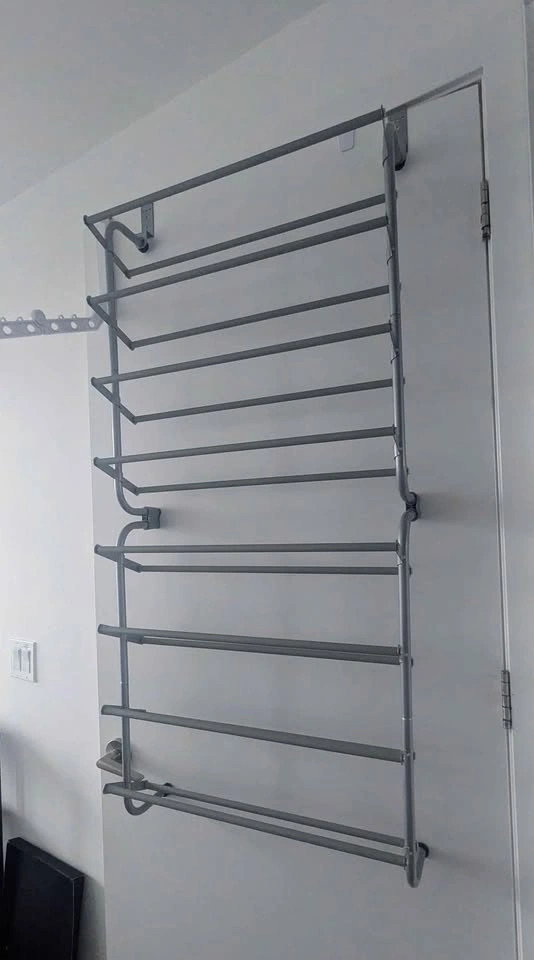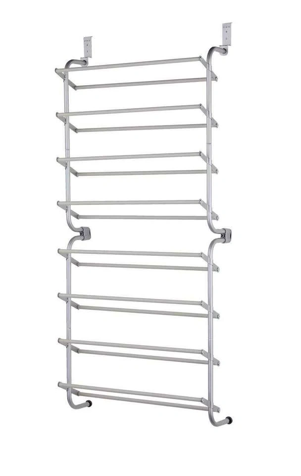 Over-the-Door Metal Shoe Rack, Silver $10 - Holds up to 24 pairs of shoes - Non-slip bars prevent shoes from slipping - Space saving compact design - Over-the-door portion fits a standard interior door thickness (1-3/8”) Dimensions: 22" x 7" x 50.8" (55.9 x 17.8 x 128.9 cm) Pick up only King and Parliament