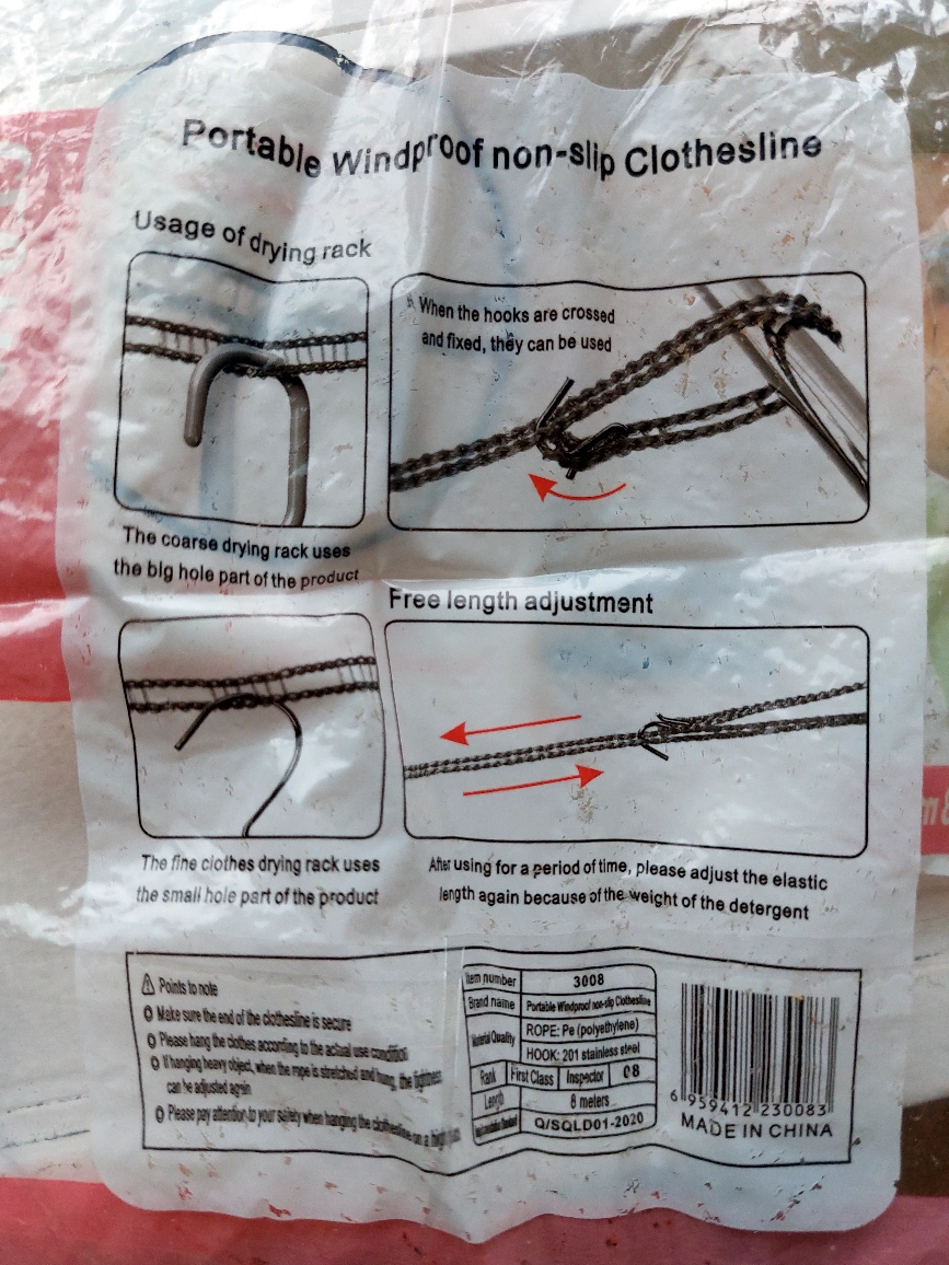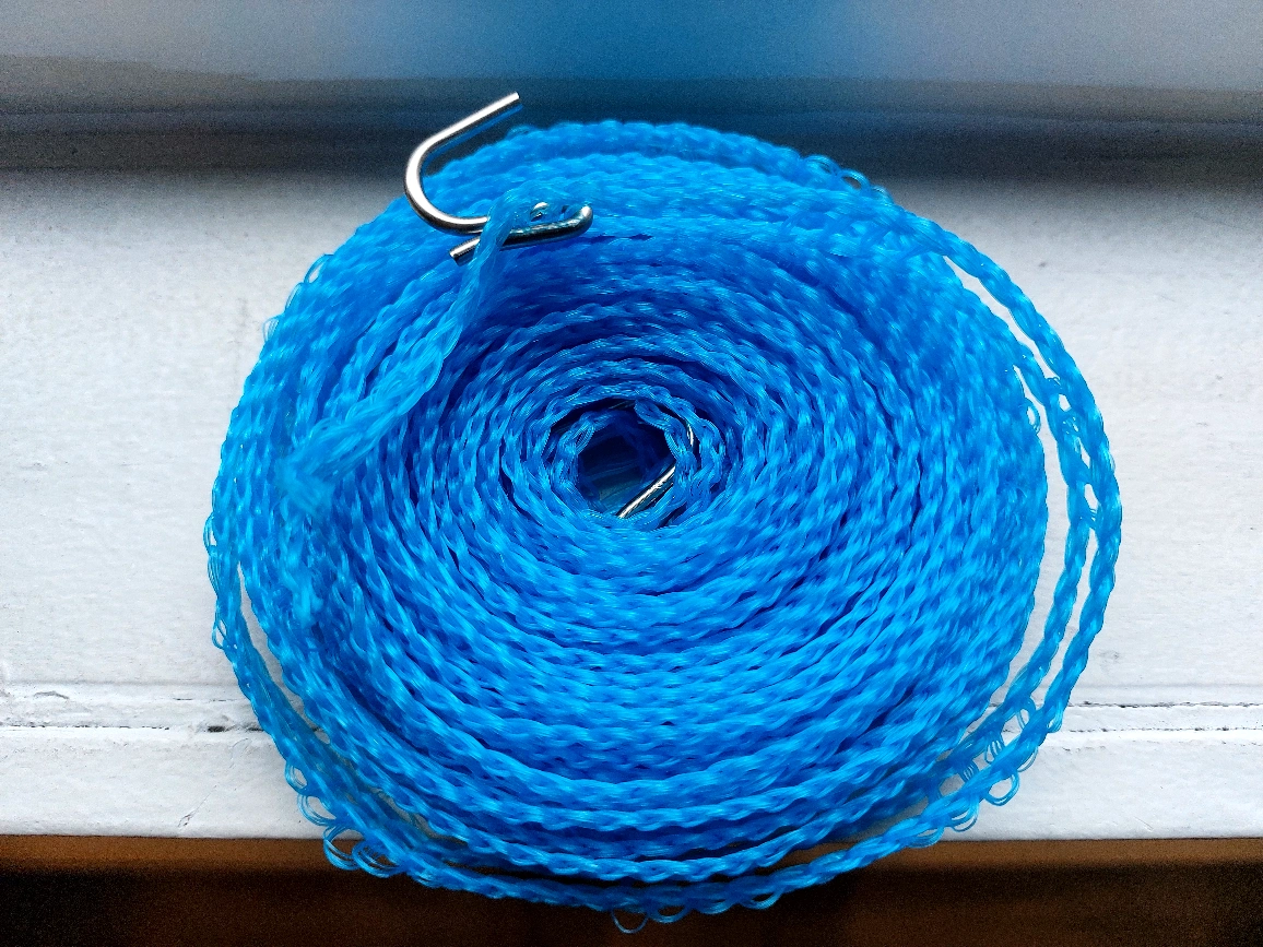 This 8m long polyethylene clothesline is ladder-style so that clothes hangers and clothes pegs do not slide to the low point. Includes two metal hooks for tying and tightening either end. Pickup at 12th Ave and Columbia St, near Broadway City Hall Skytrain.