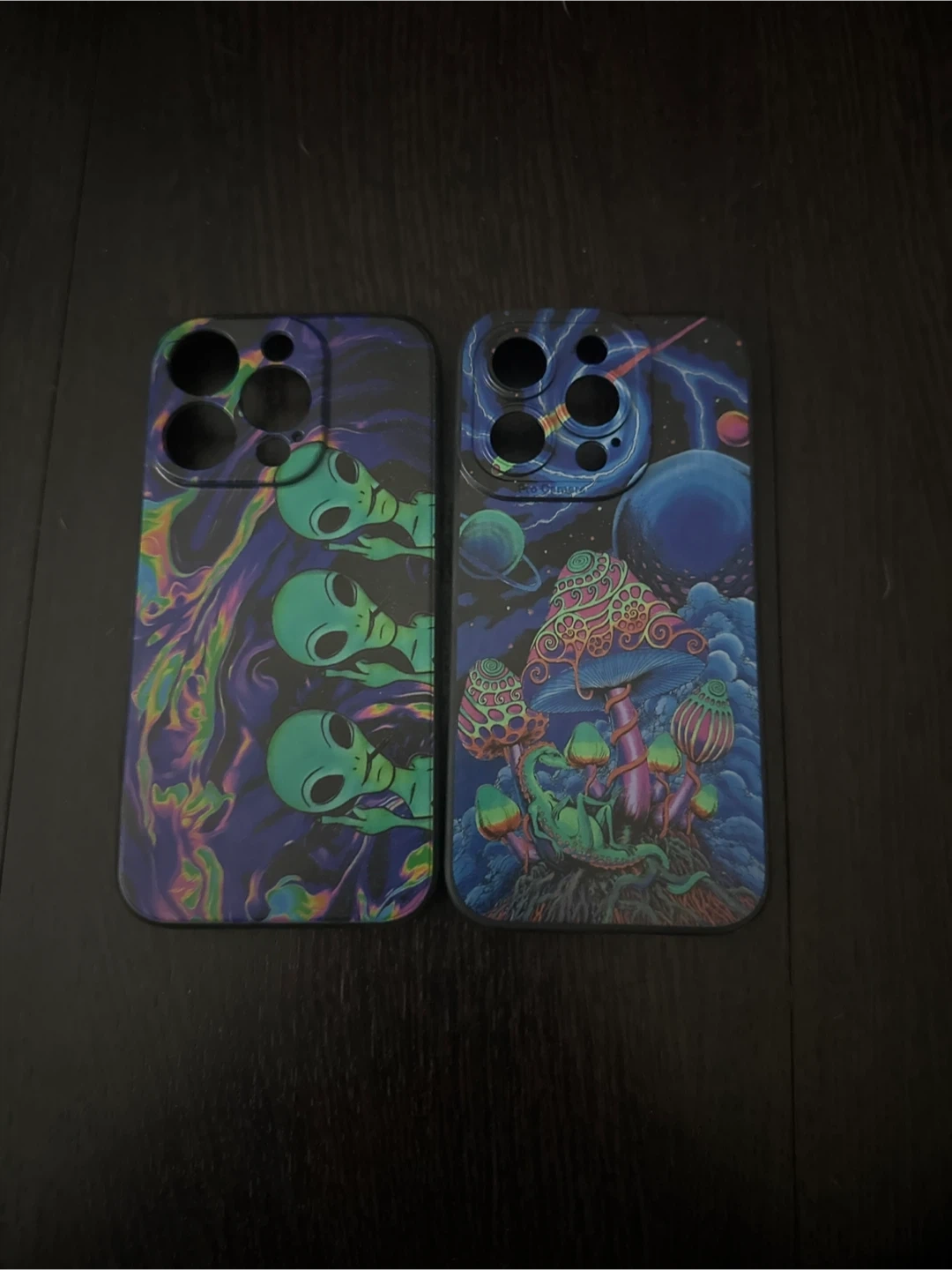 Selling two iPhone cases with unique designs! One features a cool alien graphic, and the other has a vibrant mushroom illustration. Both are in great condition and ready to protect your phone with style. $6 for both and $3 for 1.