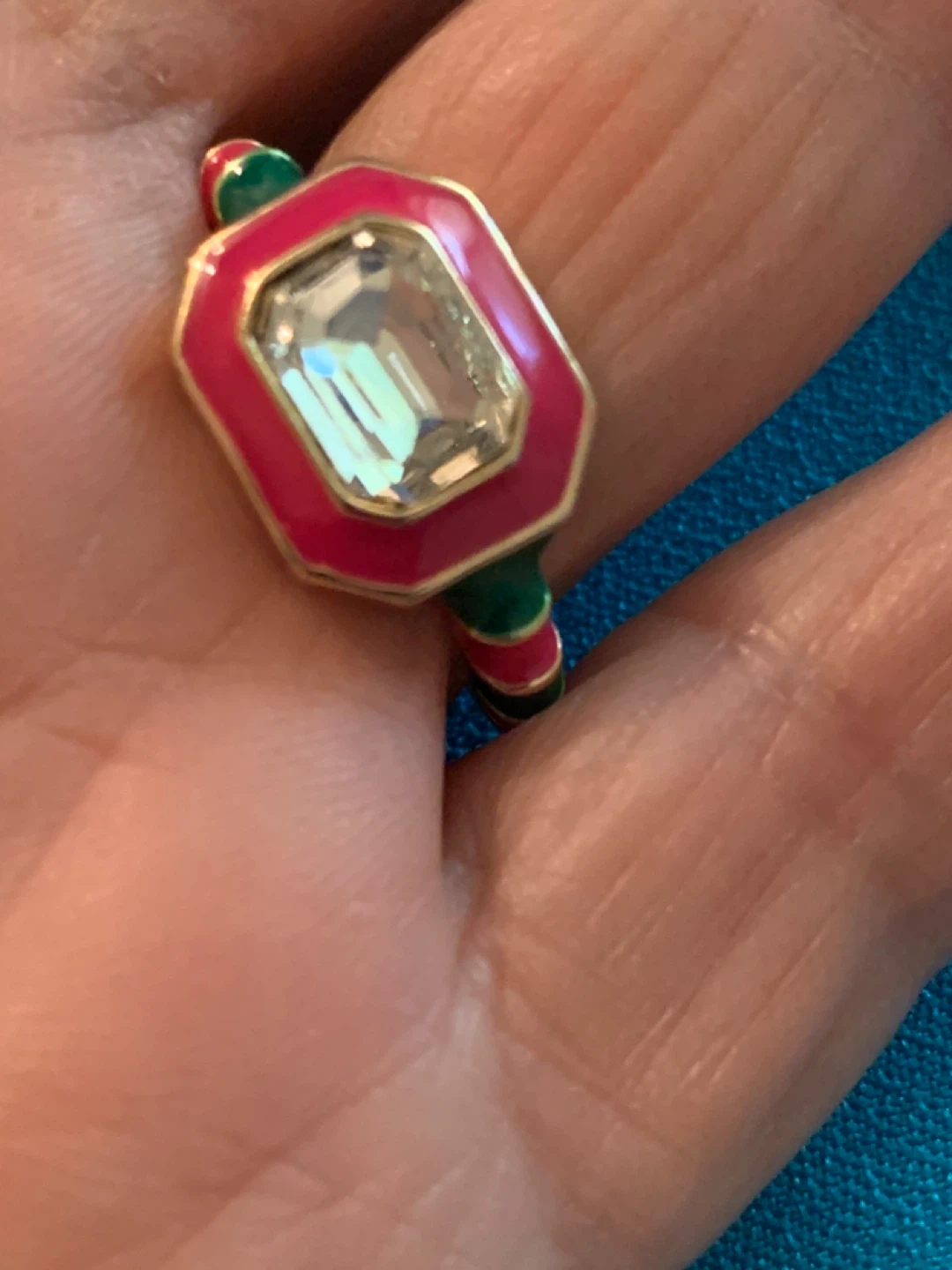 A lovely ring with a gold-tone band. The ring features a red and green enamel design around a clear, octagonal stone. It's in great condition and ready to add a pop of colour to your outfit