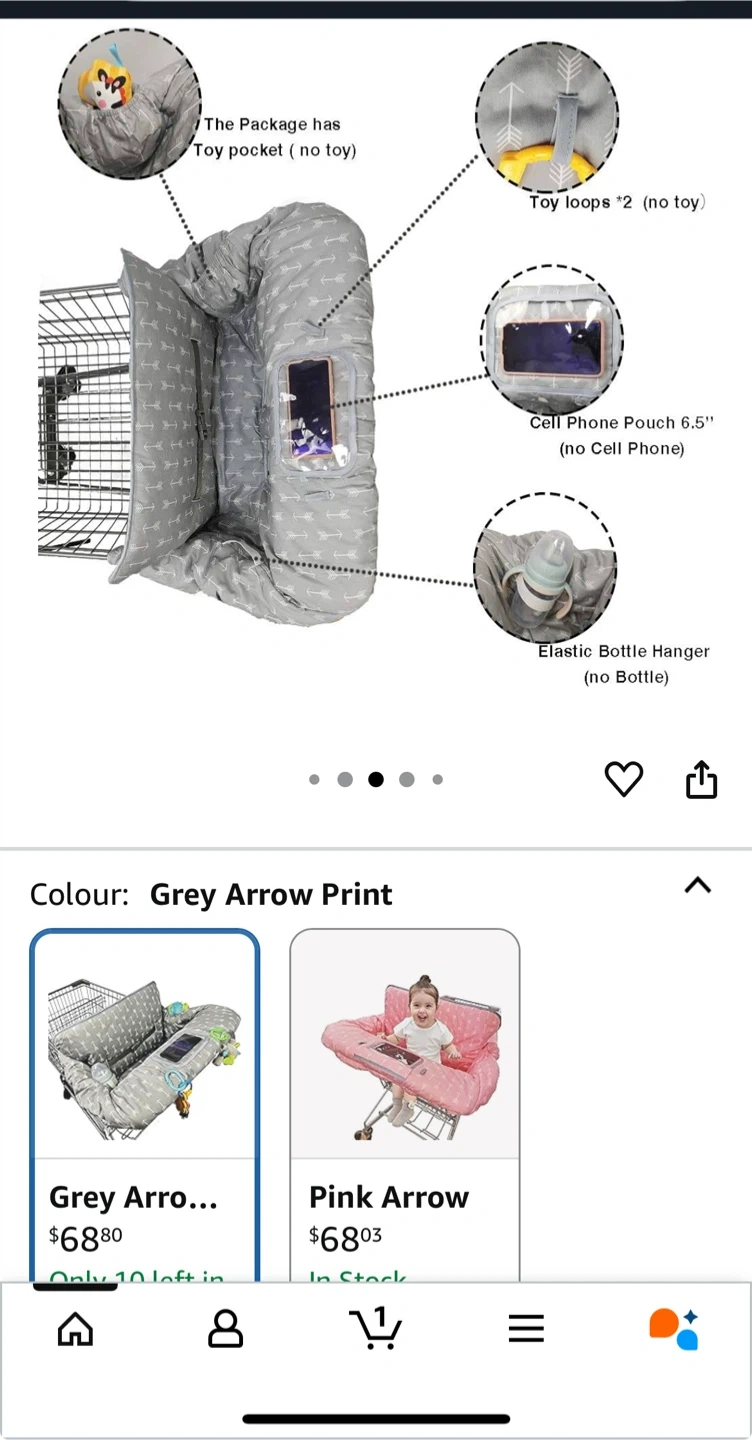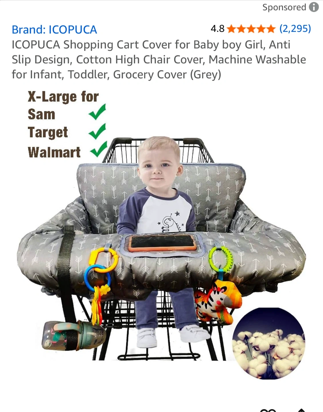 Keep your little one comfy and safe with this Icopuca shopping cart cover! It features a grey arrow print design and is made from cotton. Key features: - Anti-slip design - Machine washable - Fits infant to toddler - Includes toy loops and cell phone pouch (no toys or phone included) - Elastic bottle hanger