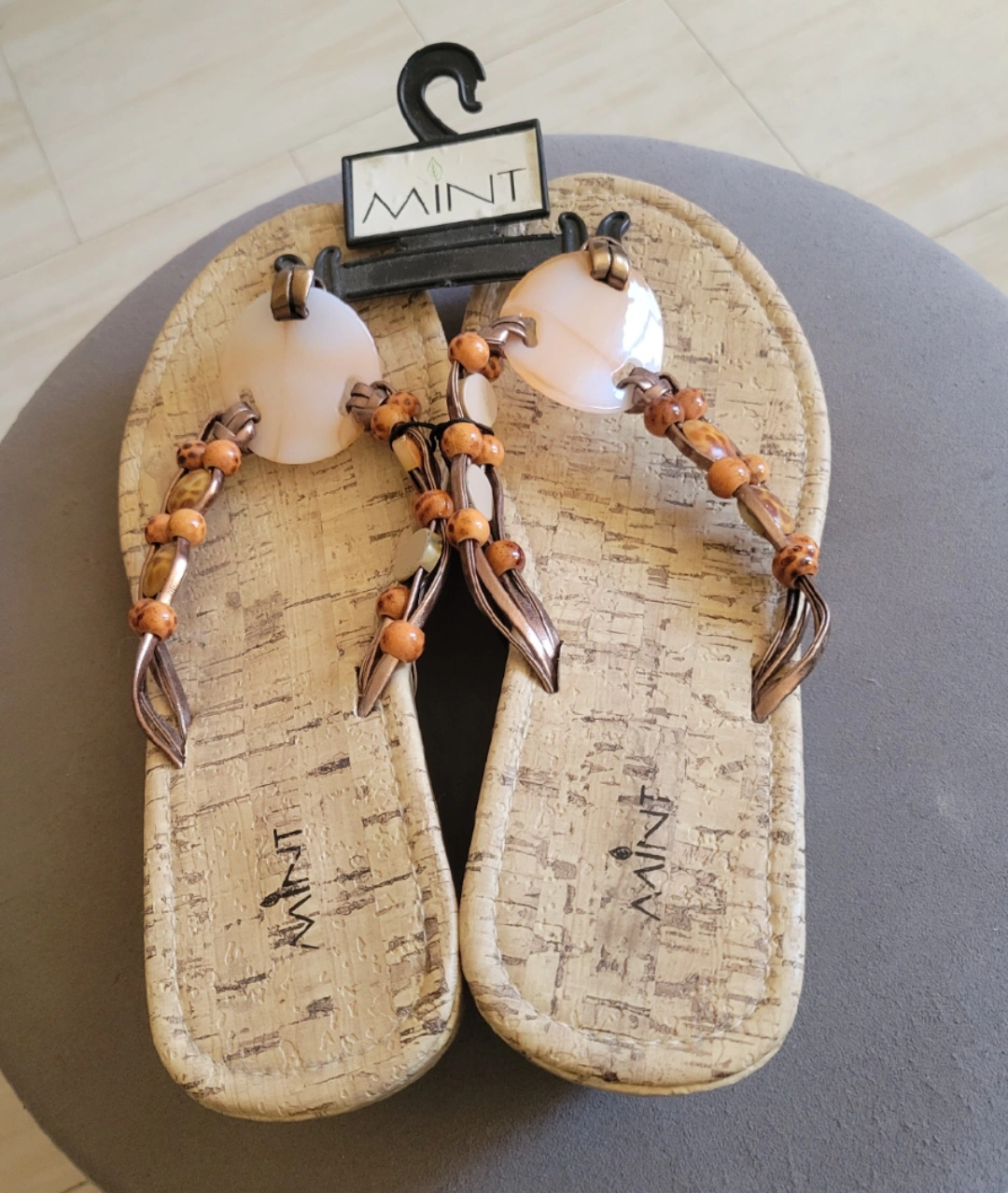 Cute Mint brand cork wedge sandals with beaded detailing. Perfect for summer!