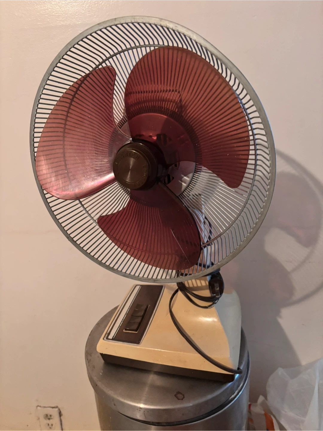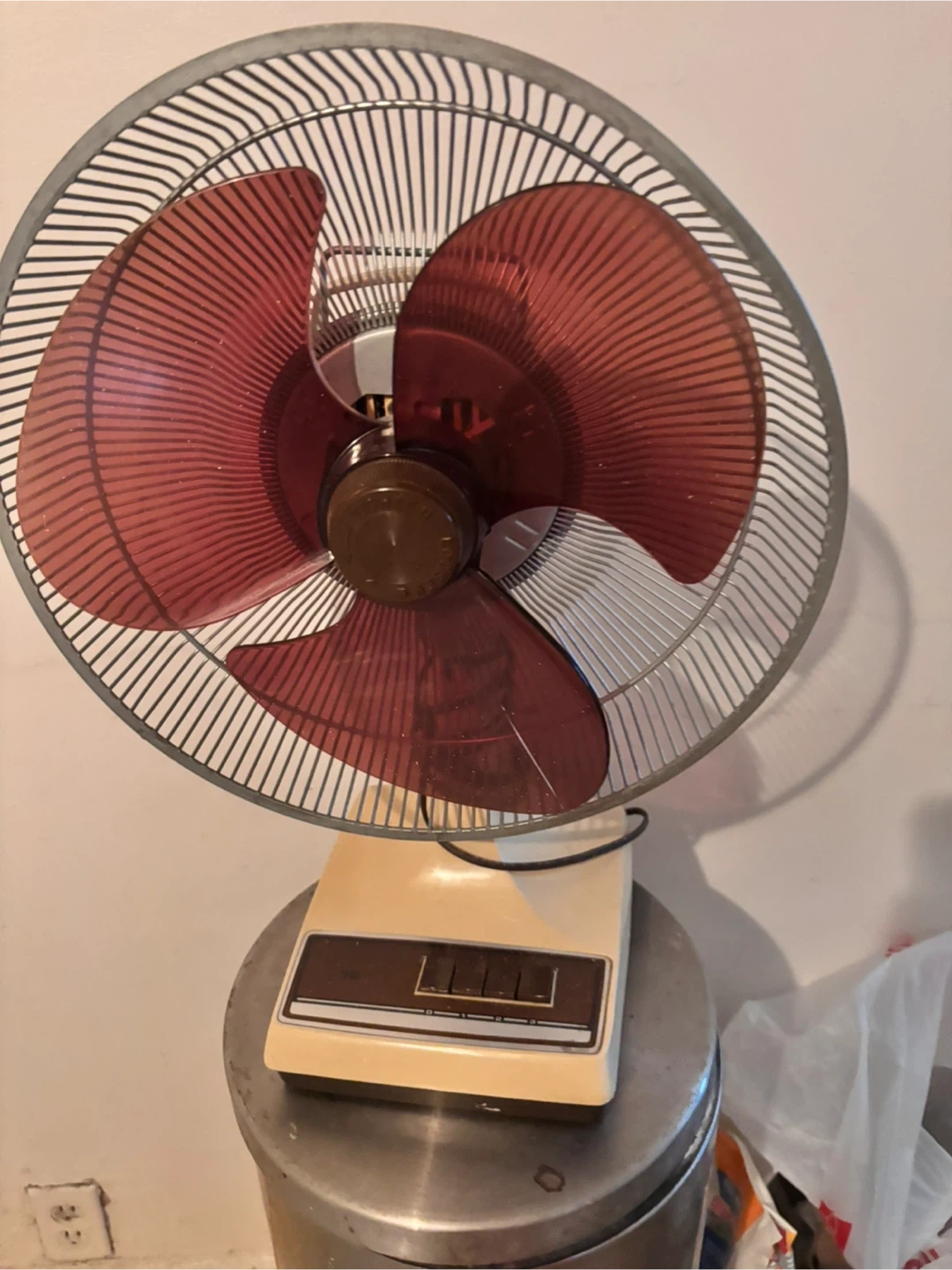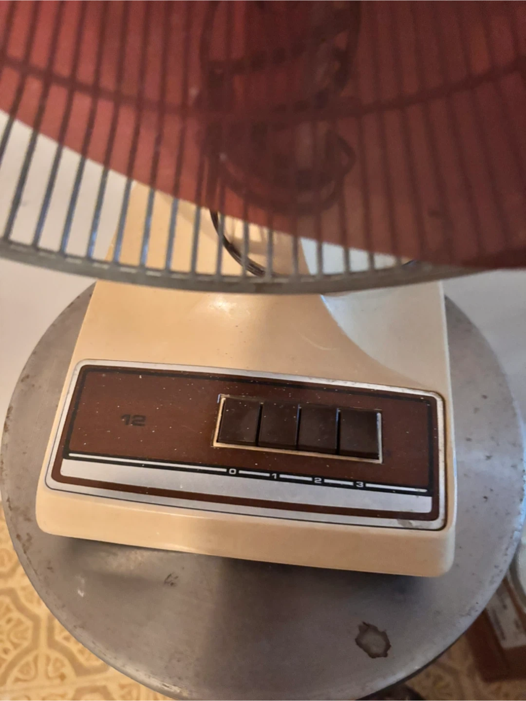 Selling a vintage table fan with unique red blades! It has a cream-coloured base and a silver cage. There are some signs of wear, but it's in good working condition. Great for adding a retro touch to any room