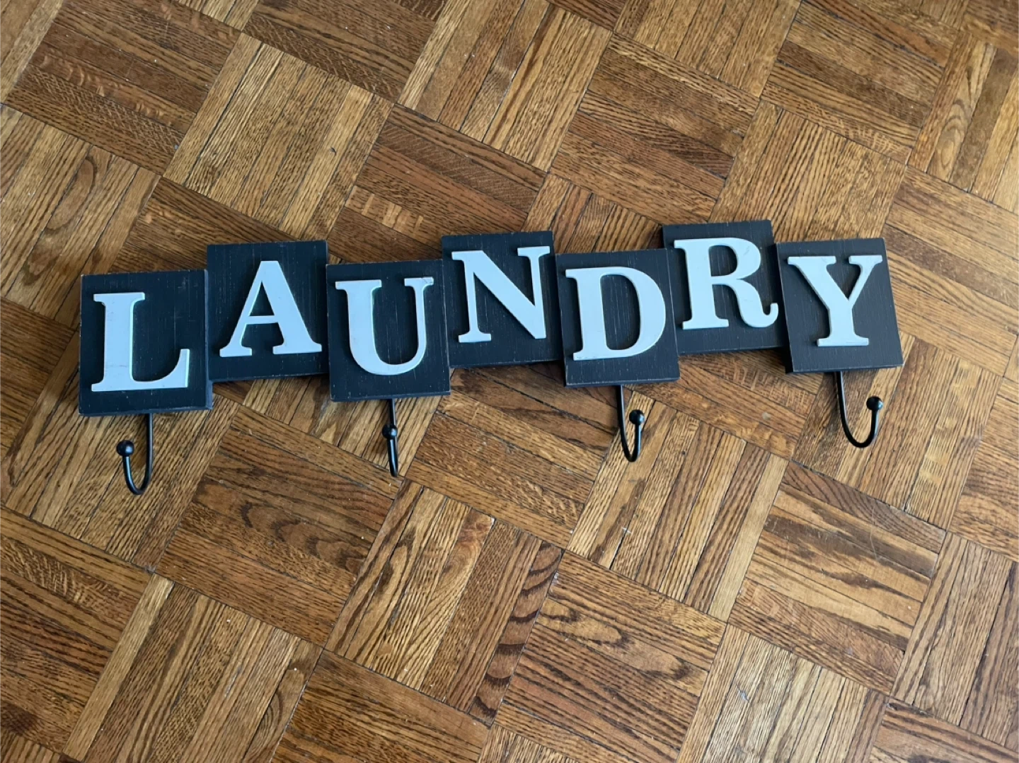 Add a touch of charm to your laundry room with this cute wall decor! It spells out "LAUNDRY" with individual black and white letter tiles, each featuring a handy hook underneath. Perfect for hanging clothes or accessories, it's both decorative and functional