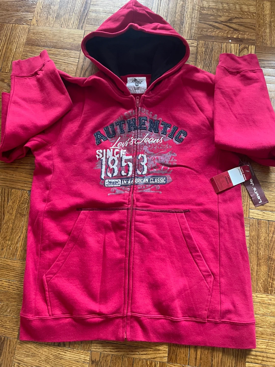 A Levi's Jeans red zip-up hoodie in size L (16/18). It features a black hood lining and a graphic print on the front. Perfect for keeping cozy!