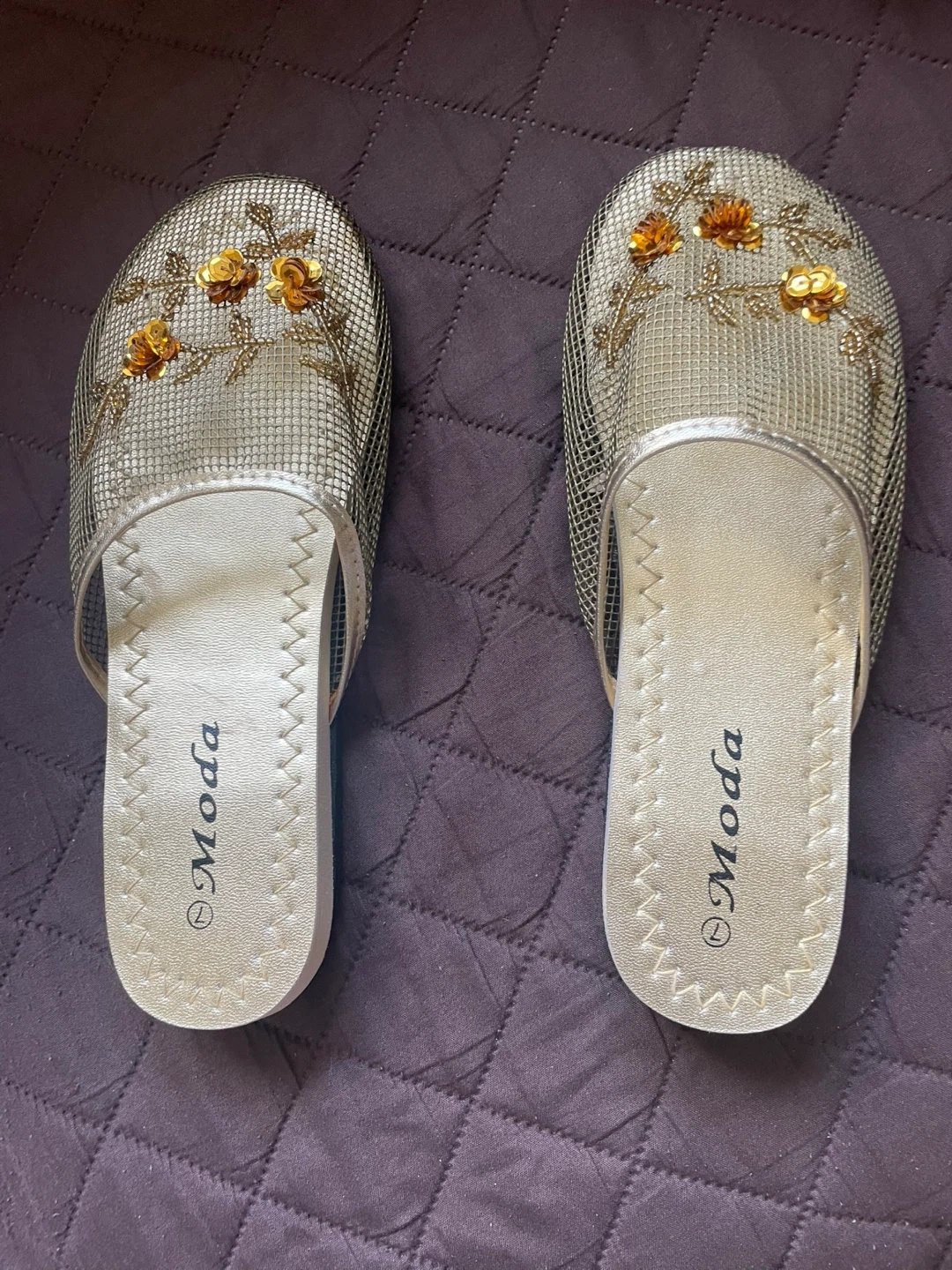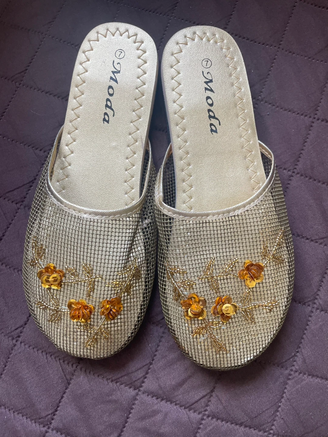 These Moda slippers are a beautiful gold colour with delicate floral embroidery. They are a size 7 and in great condition, perfect for wearing around the house or adding a touch of elegance to your outfit