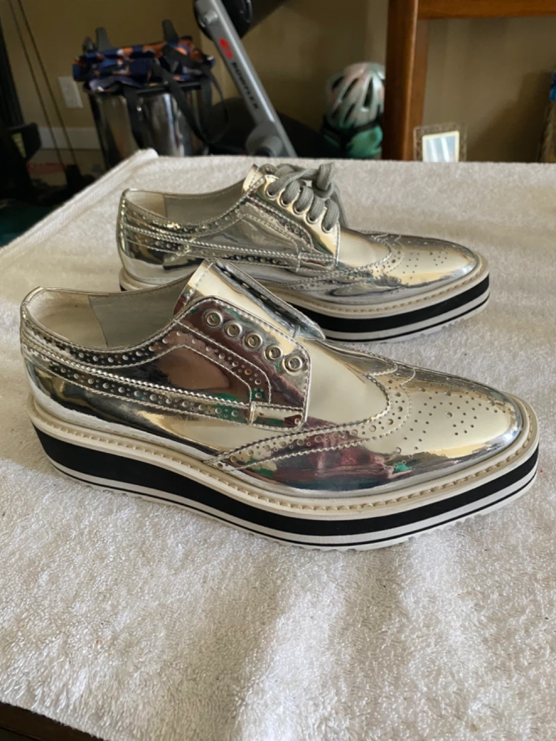 Selling a pair of Prada sneakers in silver patent leather with platform soles! They feature laser-cut accents and are in great condition. The size is IT 40, USA is 6 -6.5