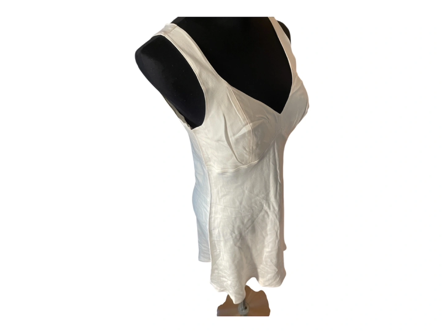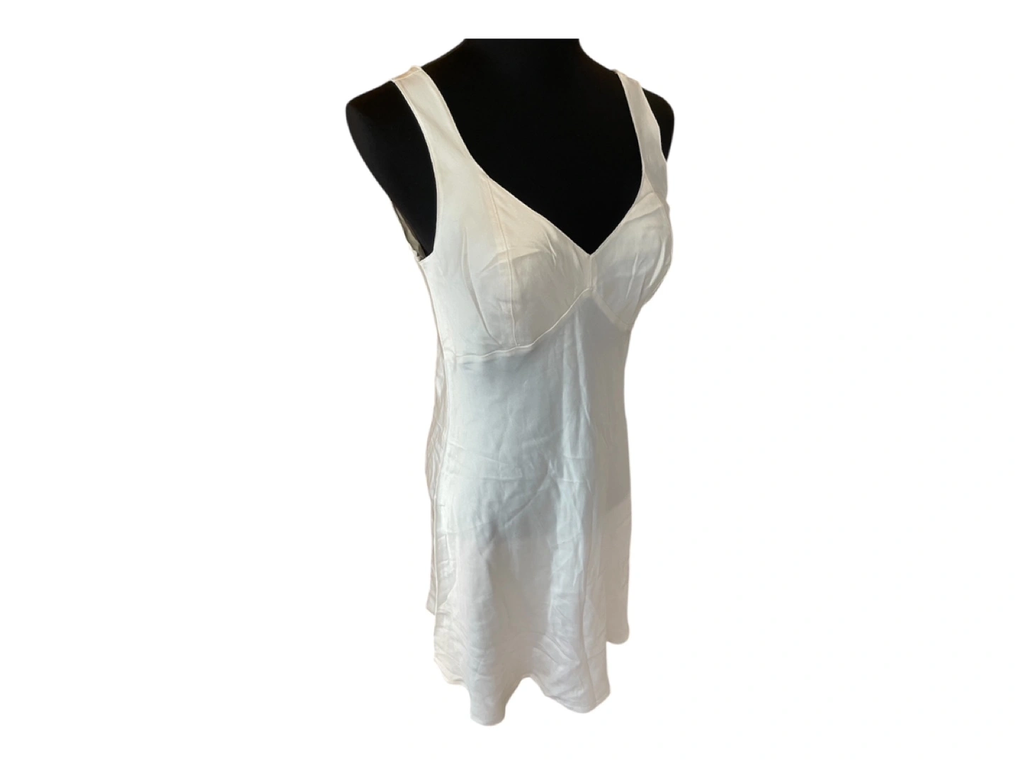 RARE Vintage 90s White Silk Mini Slip Dress V-Neckline Asymmetrical Hem Small 💎Condition: 10/10. No Stains/Rips/Tears. ✅ Certified vintage 90s 💎 RARE VINTAGE FIND! One-Of-A-Kind! Style Details: VERY 90s fashion & Very ‘Clueless’ look (the TV show) Breathable Material: SILK! High quality & VERY soft to the skin Color: White Minimalist look: simple & beautiful structured line detailing at the neckline/bust collar area Neckline: V-Neckline Thick straps Sleeveless & fitted in the armpit area A-Line Fit: structured and fitted Length: mini dress Measurements (Inches): **Model in the pictures is an overall size medium **Clothing measured on flat surface - ONLY LEFT TO RIGHT - NOT ALL AROUND CIRCUMFERENCE Size: Small Shoulder to shoulder: 11 Bust: 17 Waist: 14 Hips: 15 Length from shoulder to bottom hem: 33