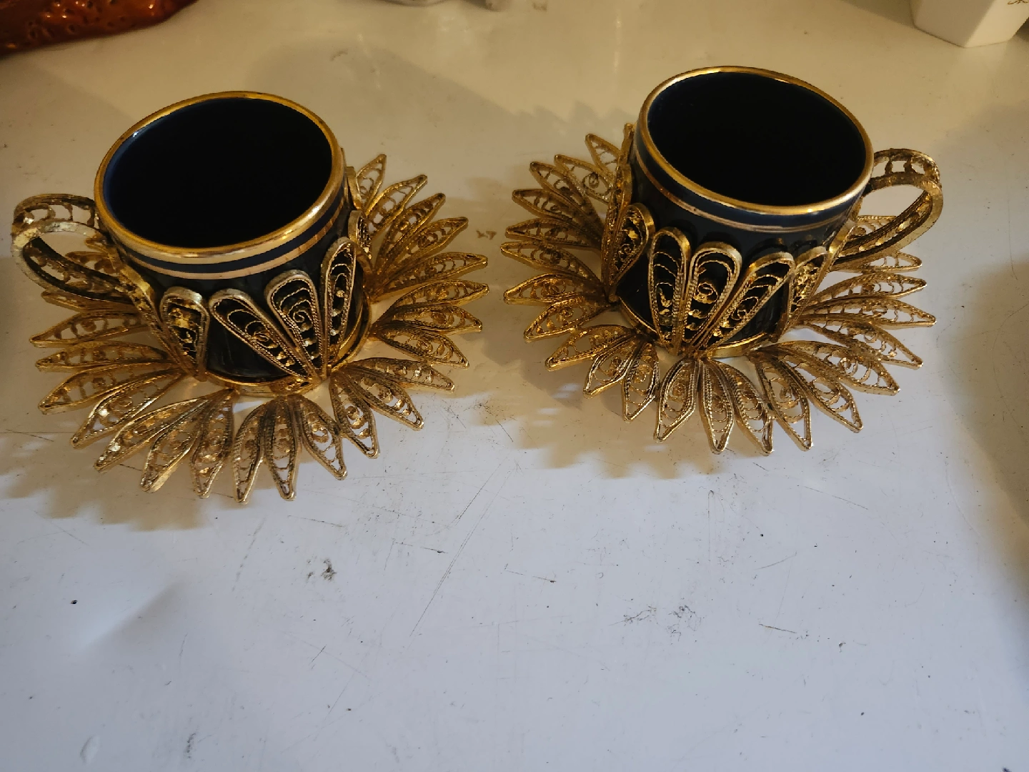 Unique decorative cup and saucer set with intricate gold detailing and a dark blue interior. These are in great condition and would make a lovely addition to any collection or home decor