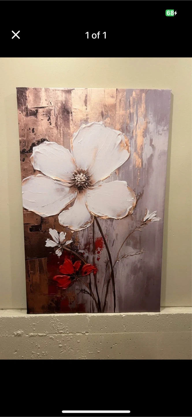 Beautiful floral canvas art with textured looking details. It features a mix of white and red flowers against a neutral background. Roughly 28 x 44 inches