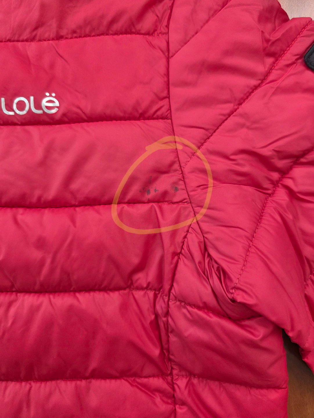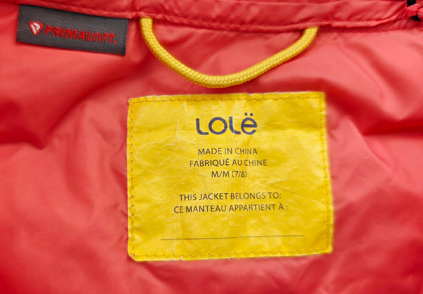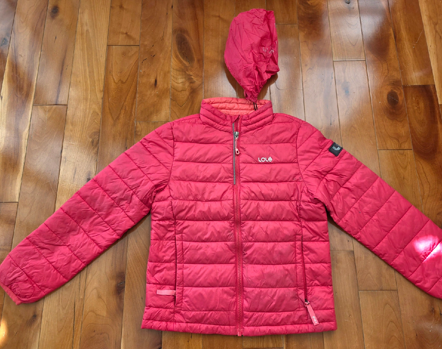 Lolë girl's jacket. It's a size M (7/8y). It also comes with a stuff sack for easy storage and portability The fabric is painted over in some places