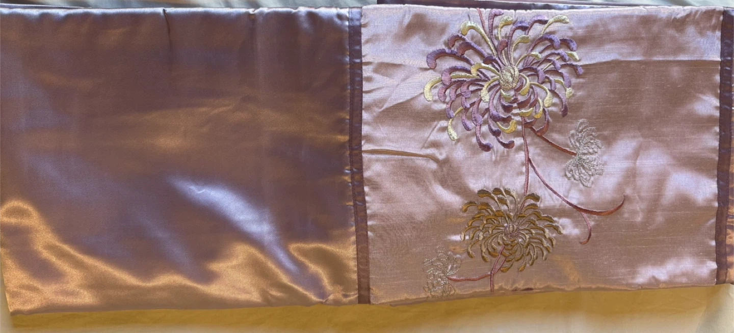 Beautiful floral embroidered duvet cover in mauve colour satin on top and cotton under . Perfect for adding a touch of elegance to your bedroom or as a gift to love ones. It is European brand measures 200x200 cm. It features a delicate floral embroidery pattern.