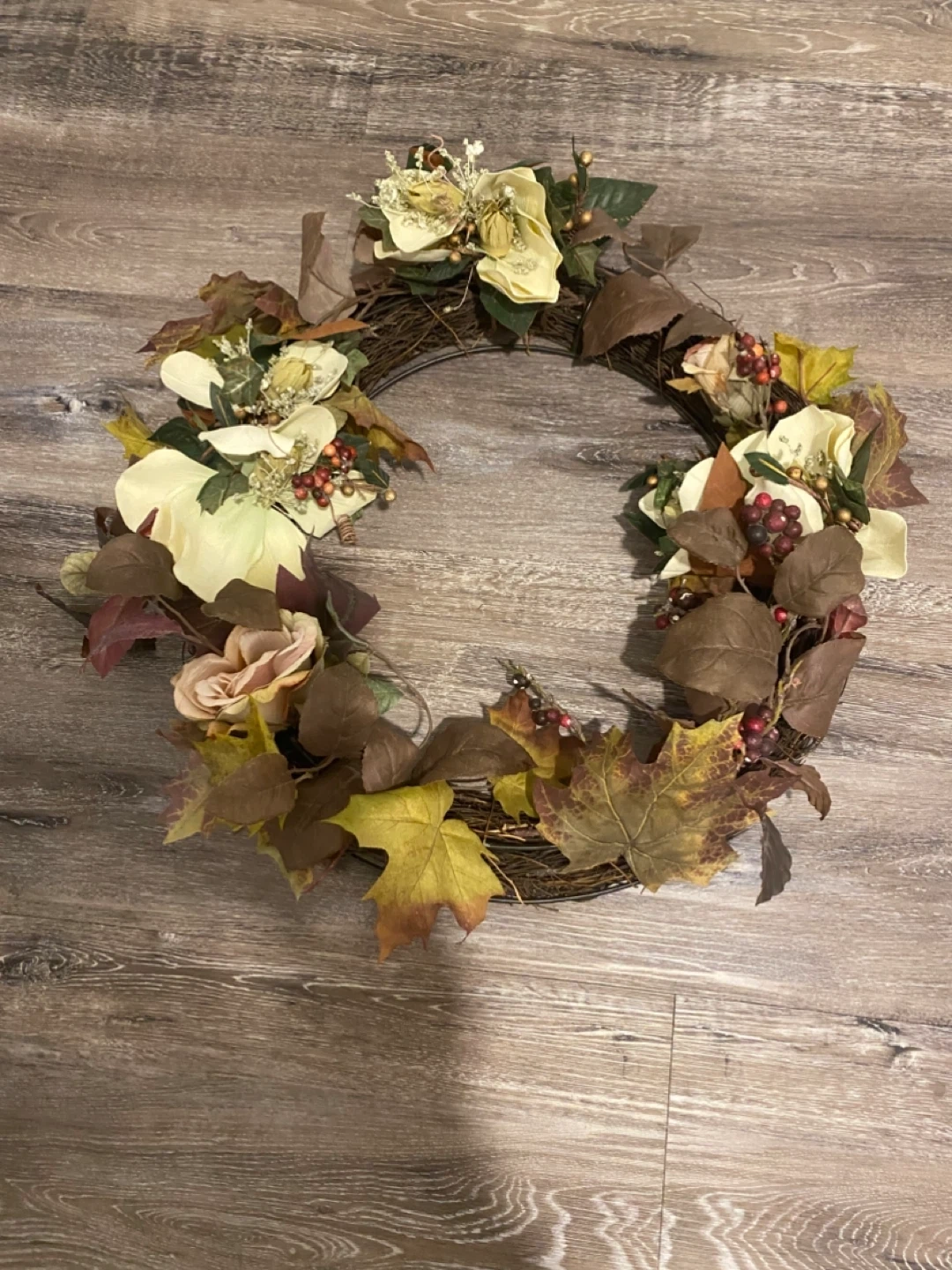 Selling a lovely fall floral wreath! It's in great condition and would be perfect for adding a touch of autumn to your home decor Pick up Sage Hill NW Cash only Check out my other items Pet and smoke free home 19 inches in diameter