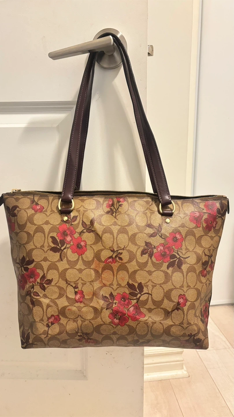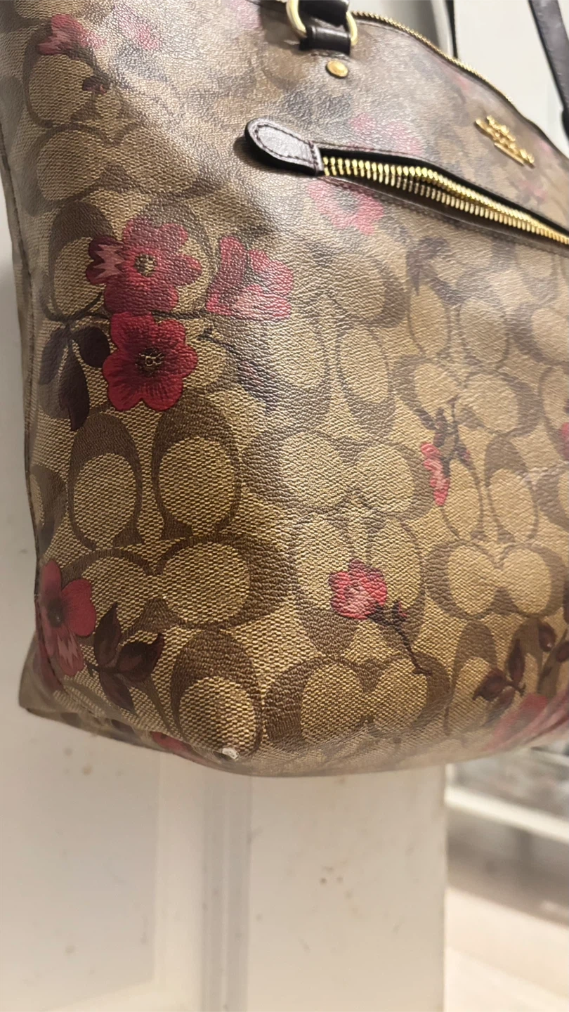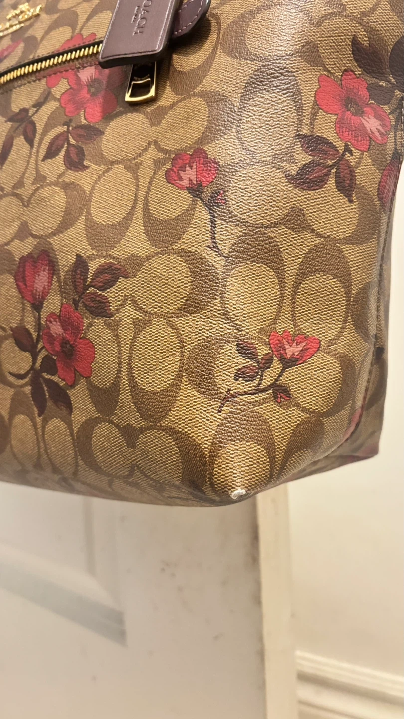 Selling a Coach tote bag with a pretty floral print! It's in good condition and perfect for everyday use. The bag has a brown interior lining with pockets. Slight red stain on the back (when worn cant see) and damage on corners (pictures shown)