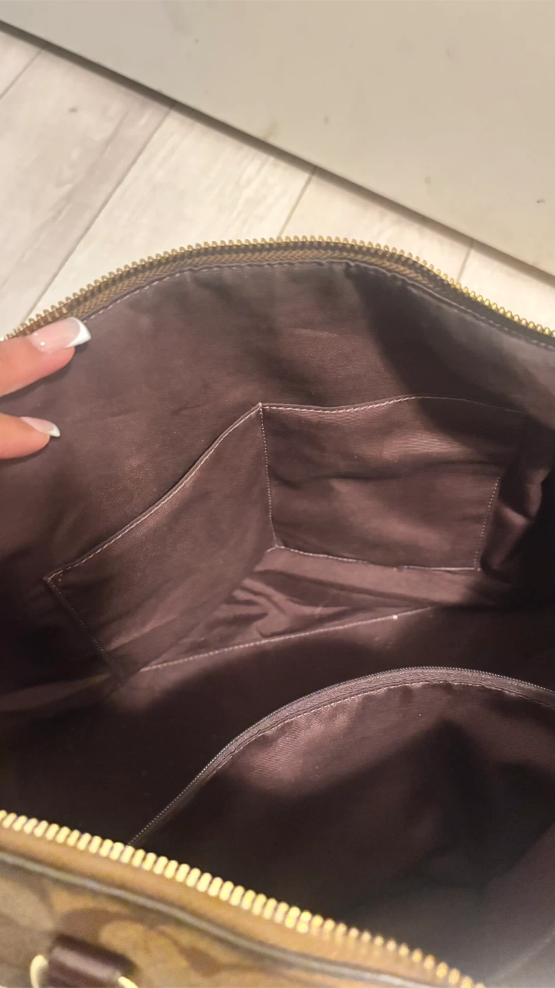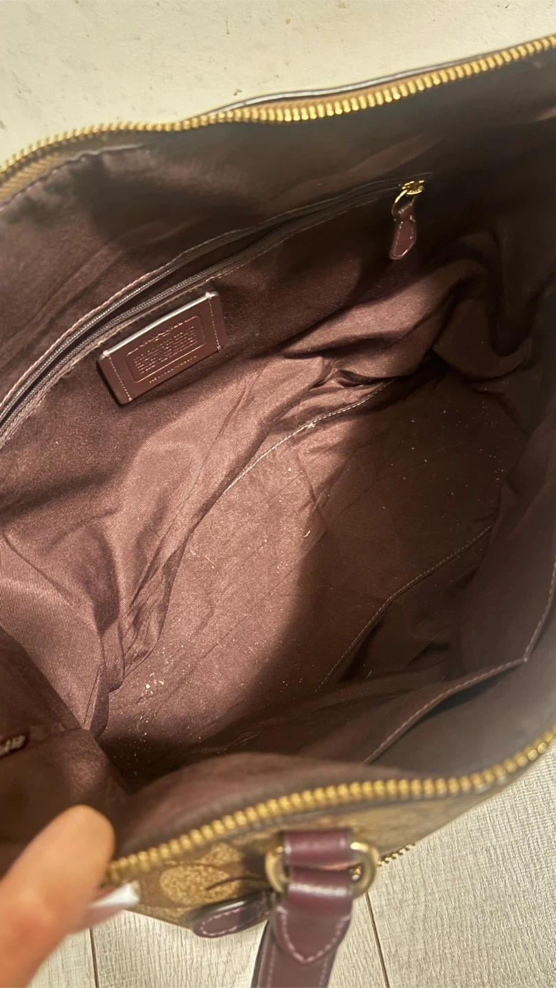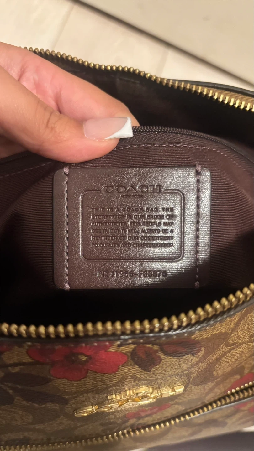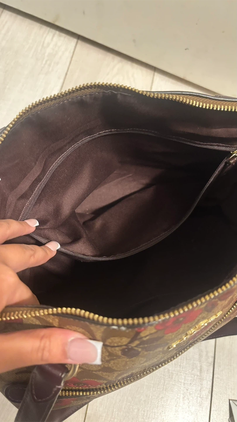 Selling a Coach tote bag with a pretty floral print! It's in good condition and perfect for everyday use. The bag has a brown interior lining with pockets. Slight red stain on the back (when worn cant see) and damage on corners (pictures shown)