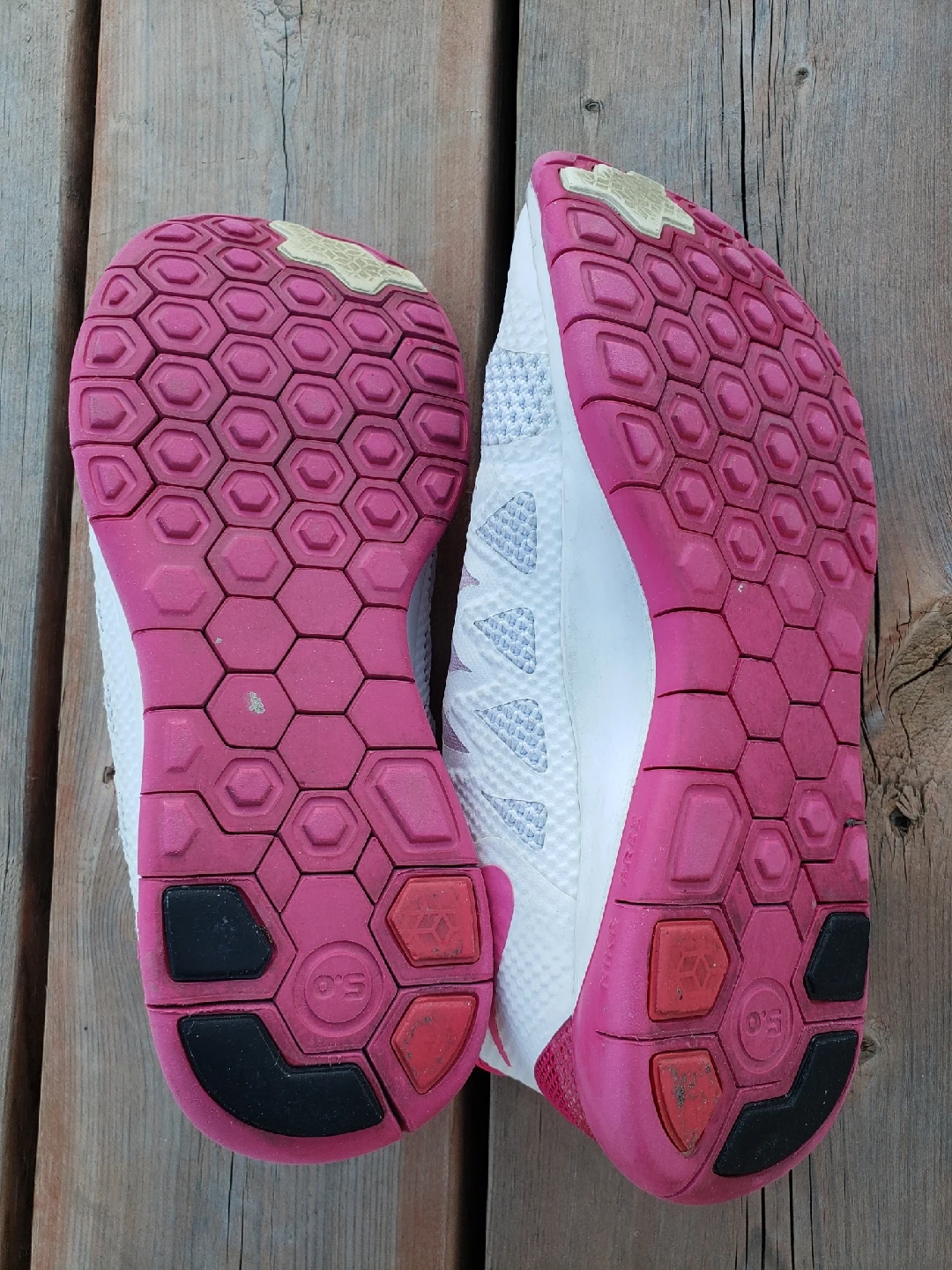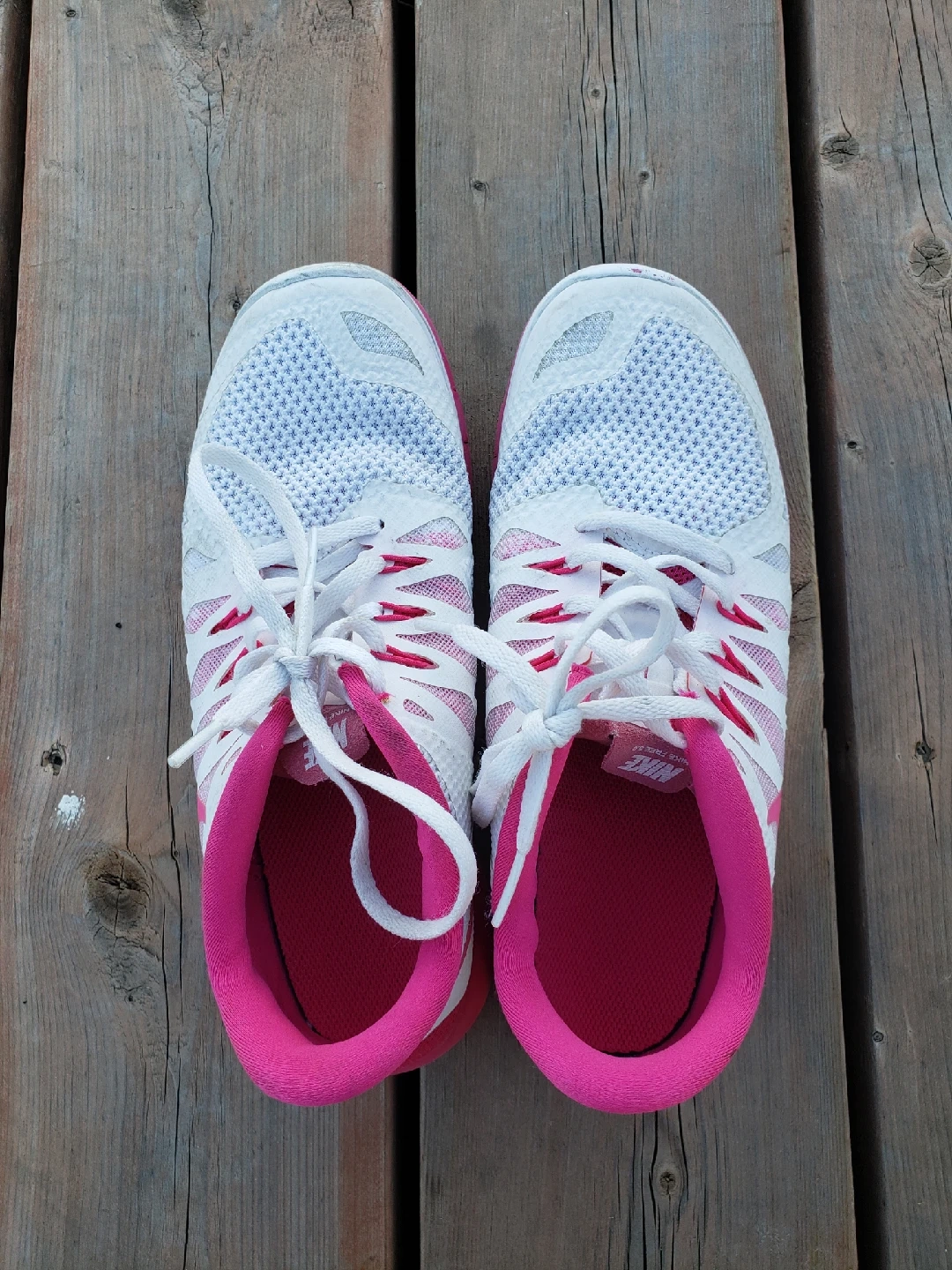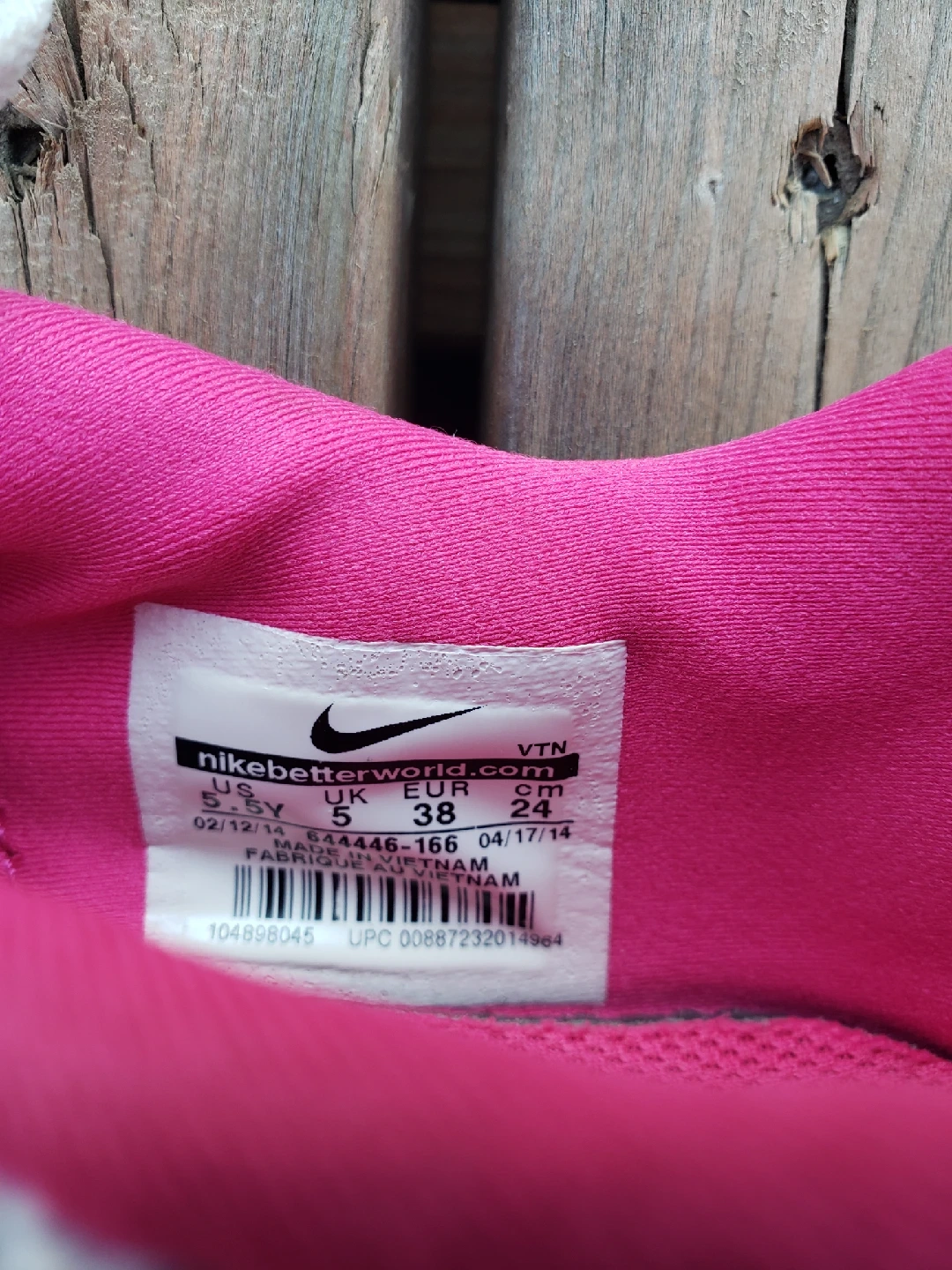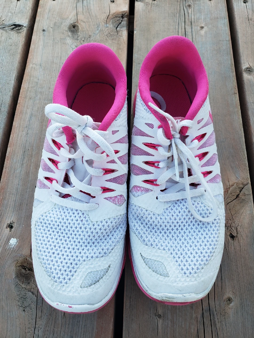 Selling a pair of Nike Free 5.0 running shoes in youth size US 5.5. They're white with pink accents and in gently used condition. Great for running or everyday wear!
