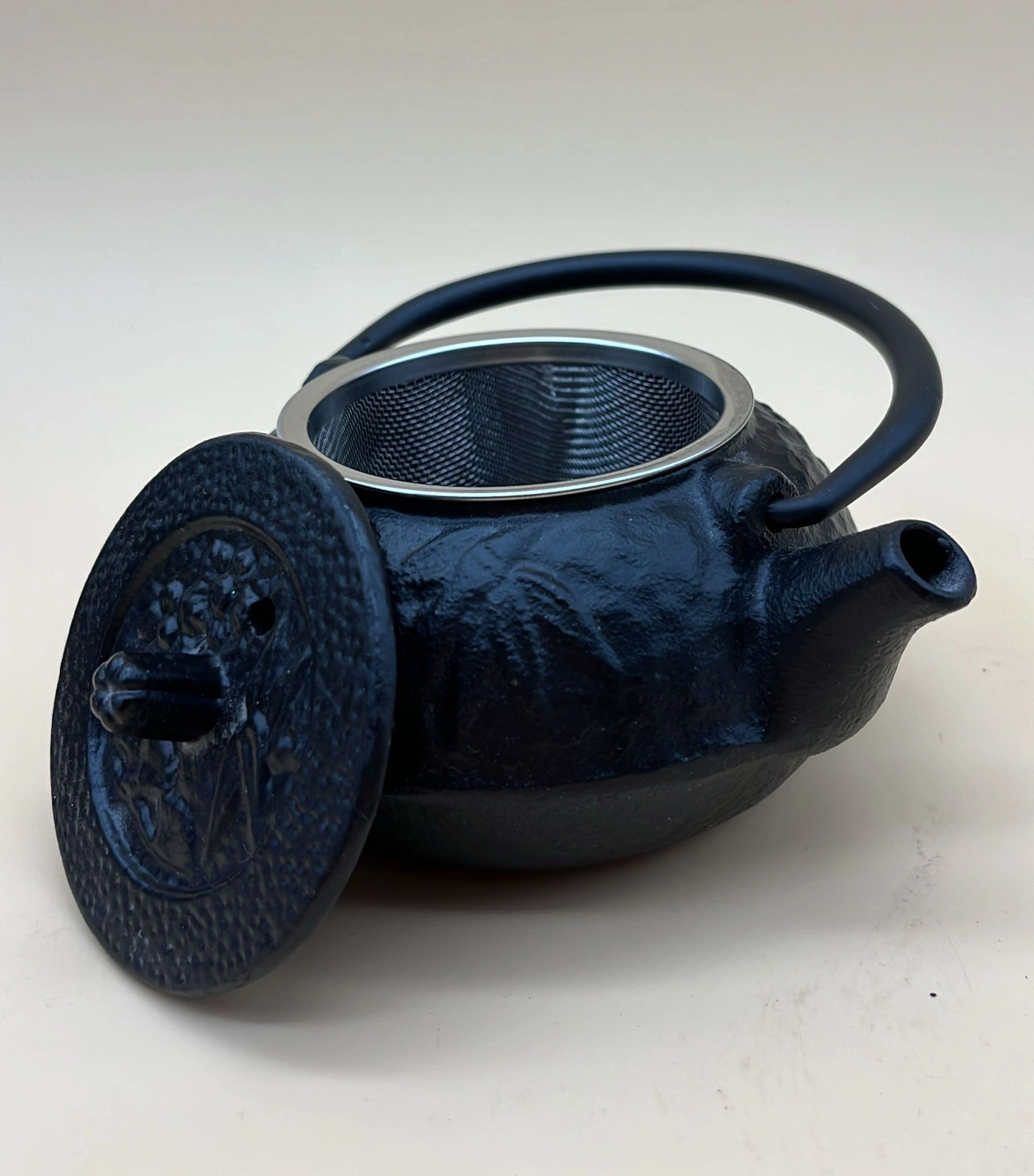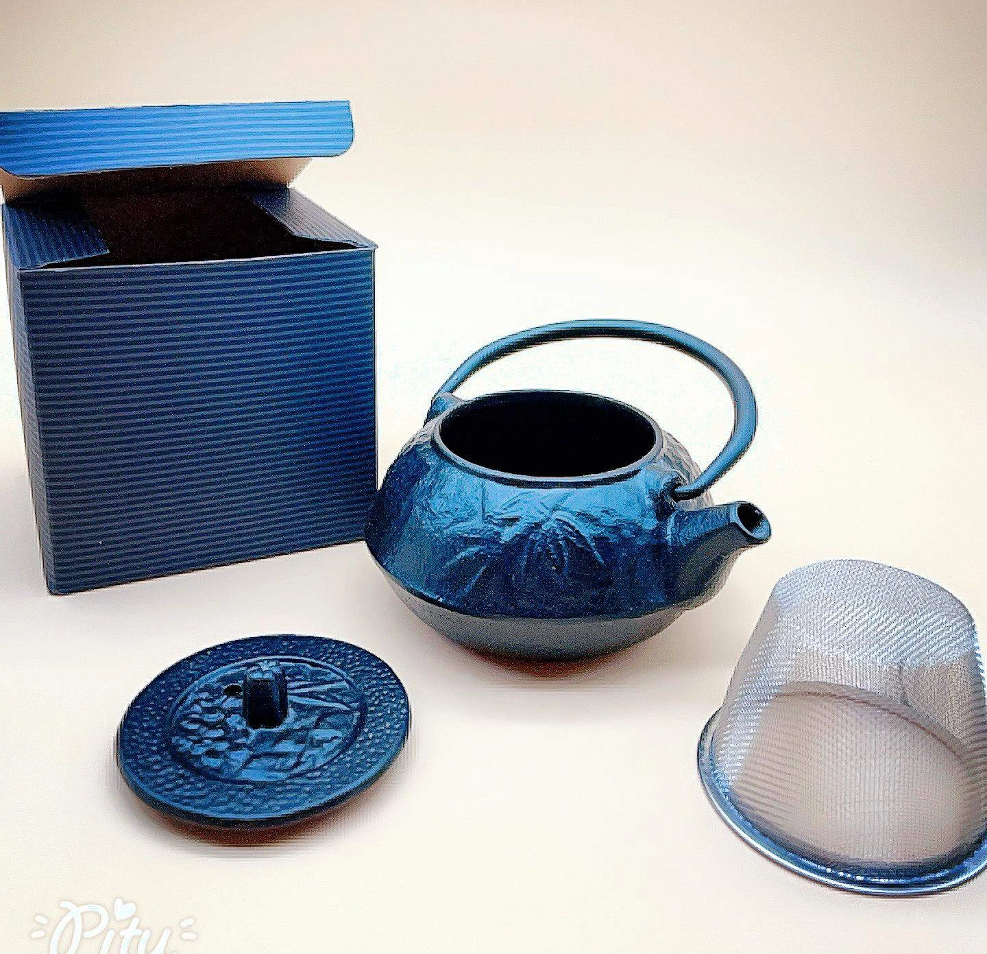 This teapot makes with box a beautifully delicate decorative piece.This is a set of coffee filter and a black teapot. The filter is made of metal and has a rounded shape, while the teapot shell has an interesting texture and is black in color. The overall look is very modern.