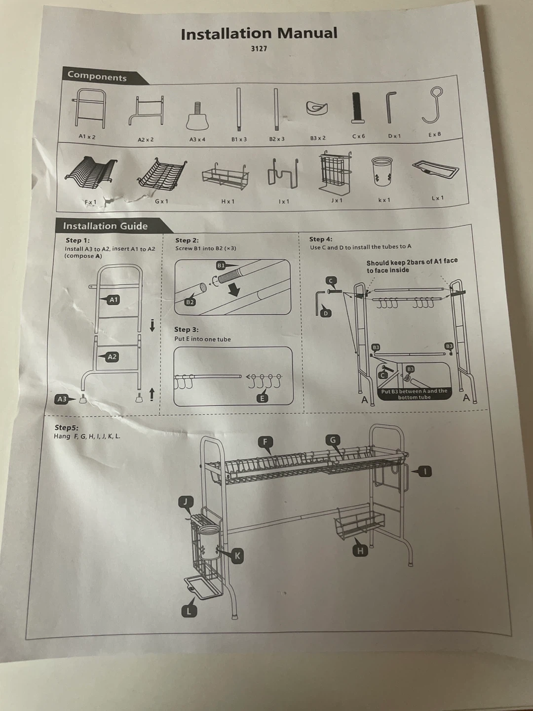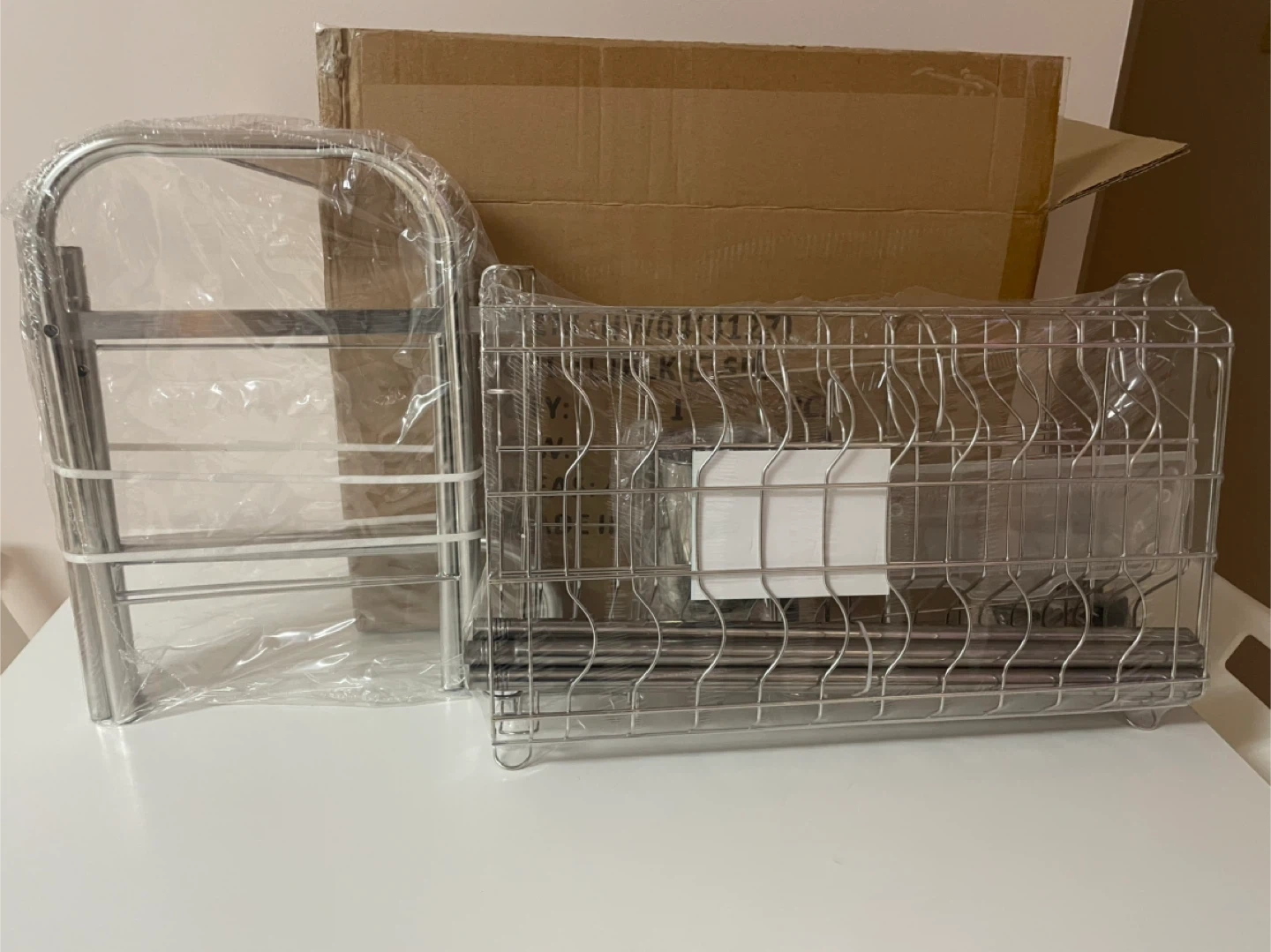 Selling a stainless steel dish drying rack. It comes with all the components as shown in the installation manual. The box is included as well, making it easy to transport