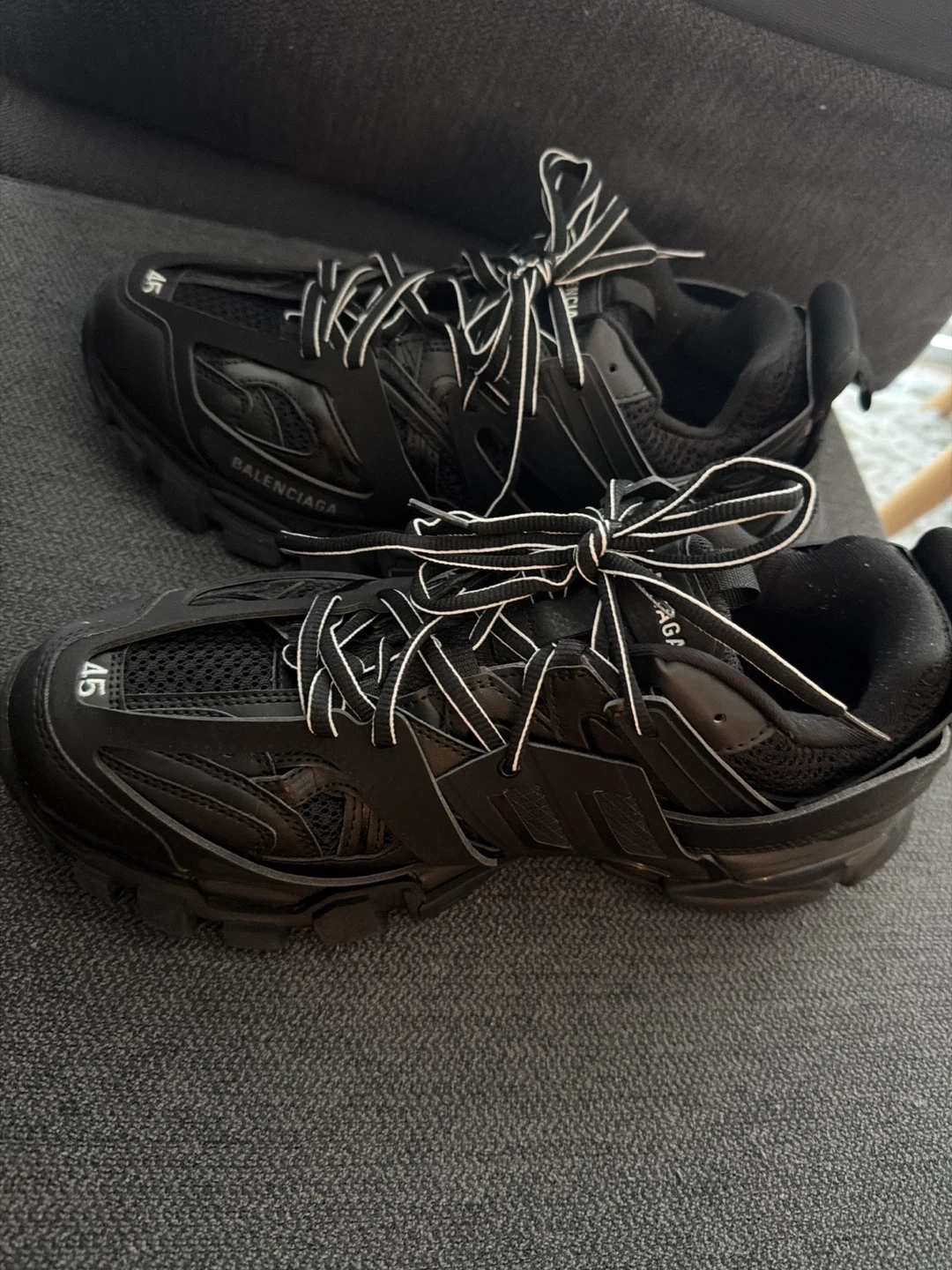 Selling a pair of Balenciaga Track sneakers in size 12 US. They're in great condition and ready for a new home! These stylish sneakers feature a unique design and are perfect for adding a touch of high fashion to your everyday look