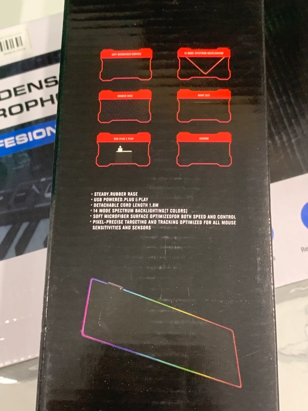 I'm selling a brand new gaming mouse pad! It has a steady rubber base and is USB powered for plug and play. It also has a detachable cord length of 1.8m and 14 mode spectrum backlighting (7 colors)! The soft microfiber surface is optimized for both speed and control, with pixel-precise targeting and tracking optimized for all mouse sensitivities and sensors