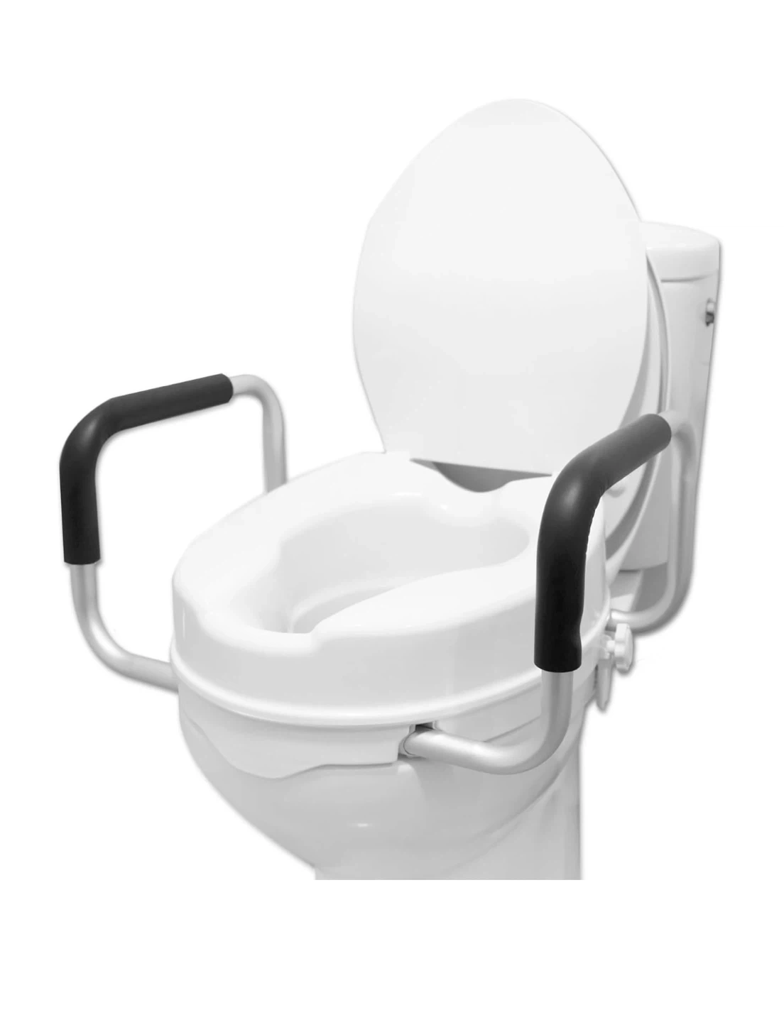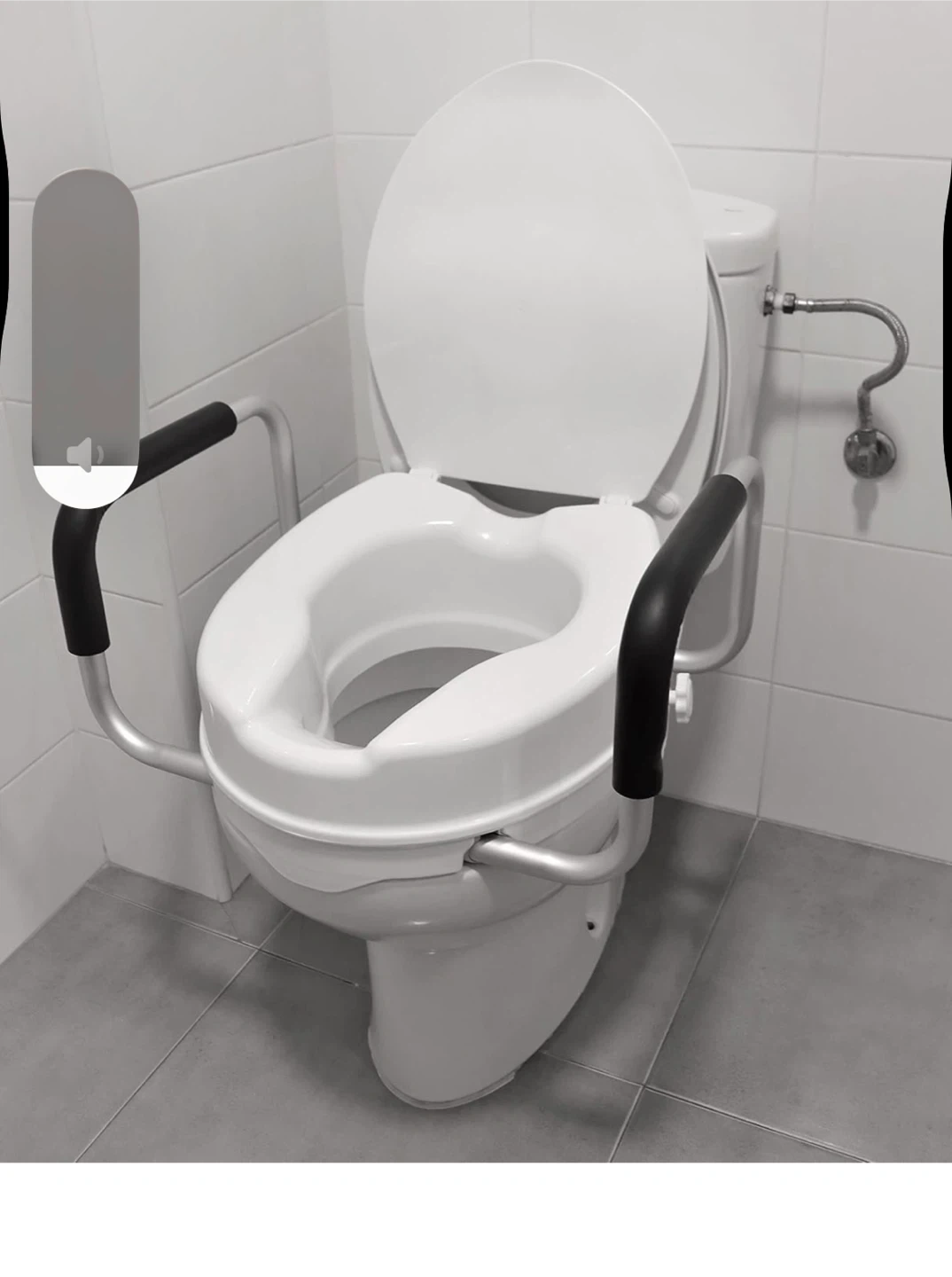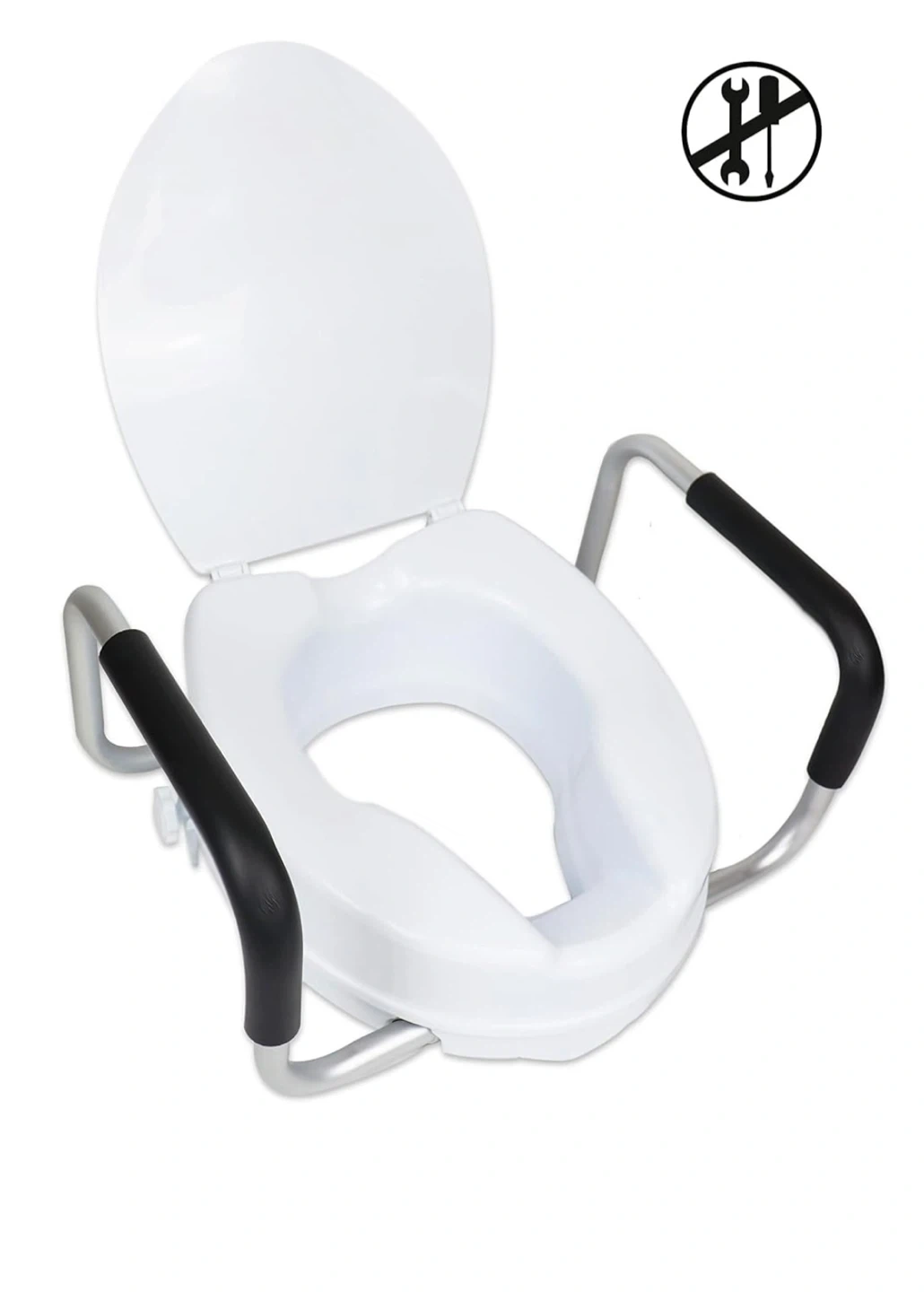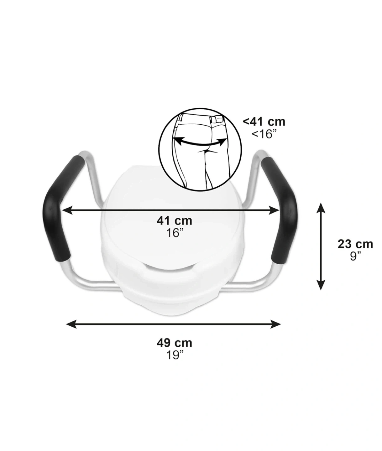 Selling a raised toilet seat with safety rails. The seat is white, and the rails have black grips. It measures approximately 16 inches wide and 9 inches high. Great for anyone needing extra support and assistance! brand new box pack