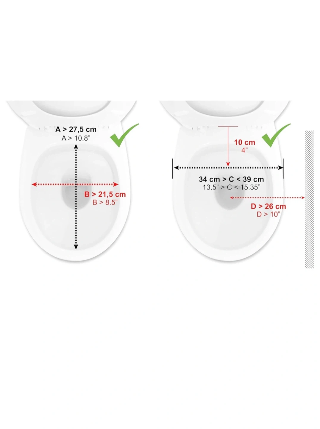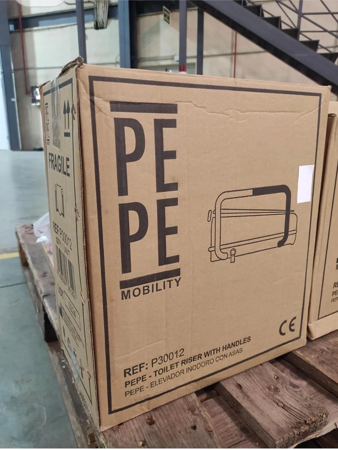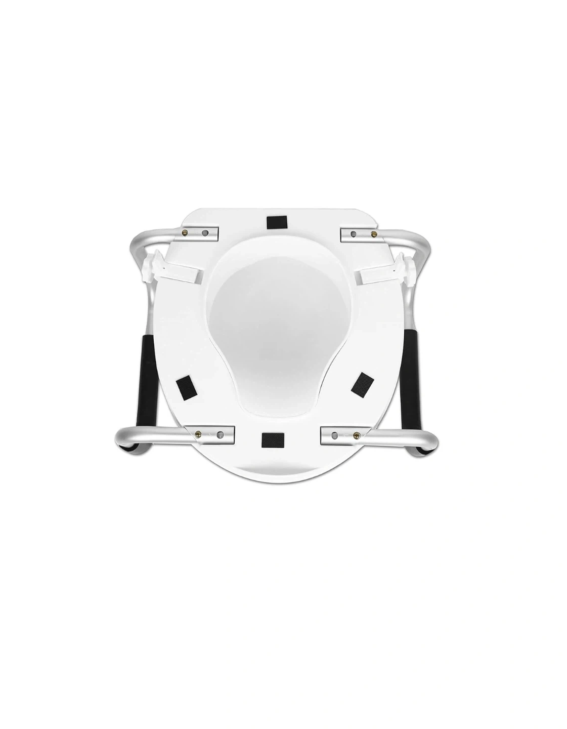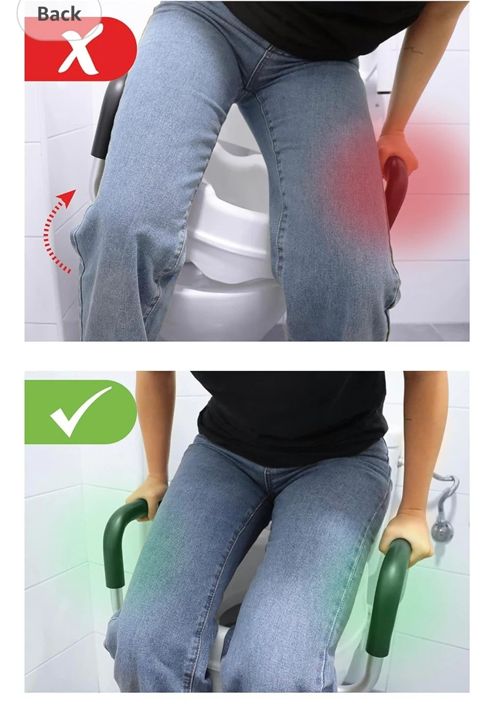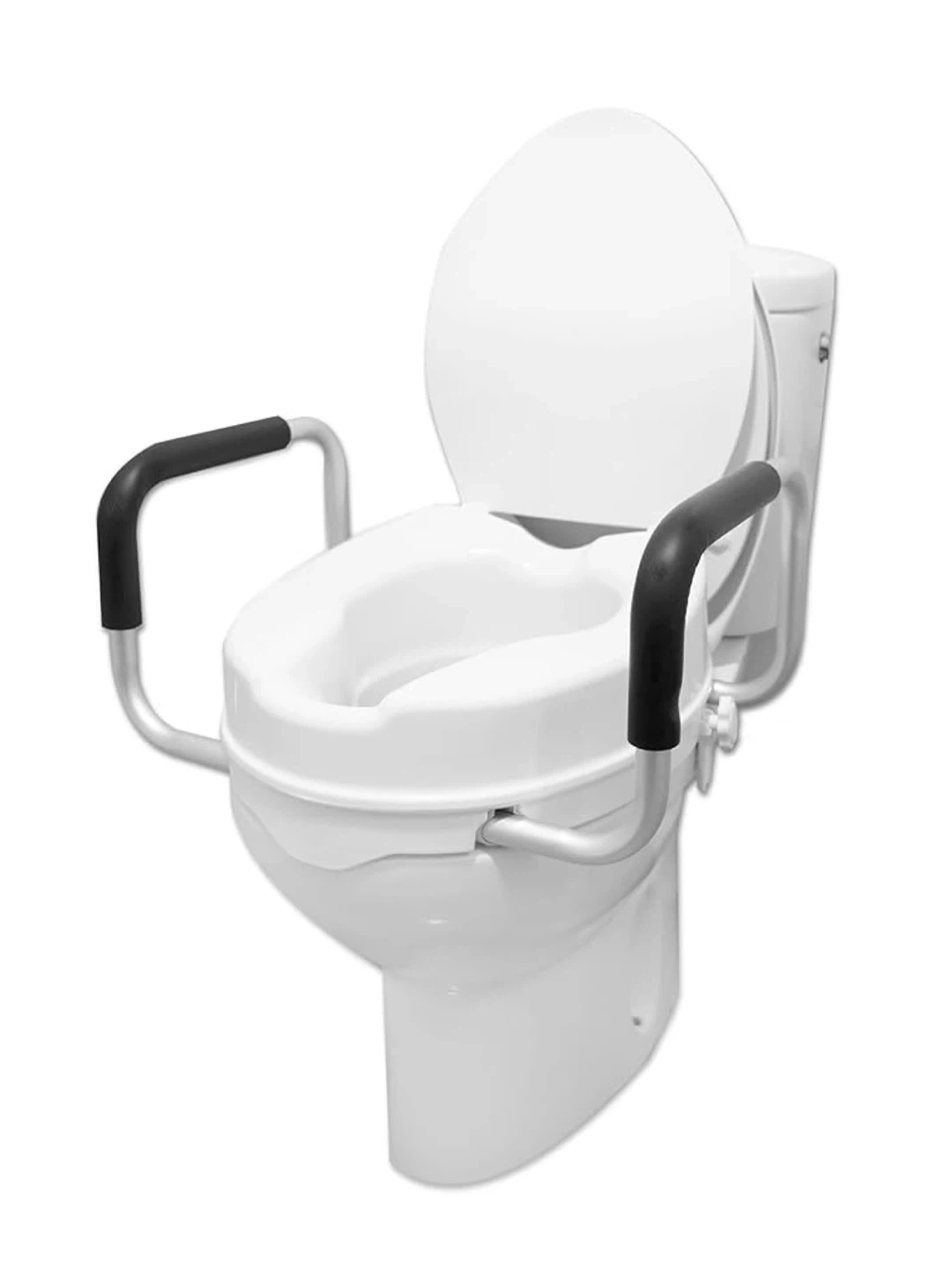 Selling a raised toilet seat with safety rails. The seat is white, and the rails have black grips. It measures approximately 16 inches wide and 9 inches high. Great for anyone needing extra support and assistance! brand new box pack