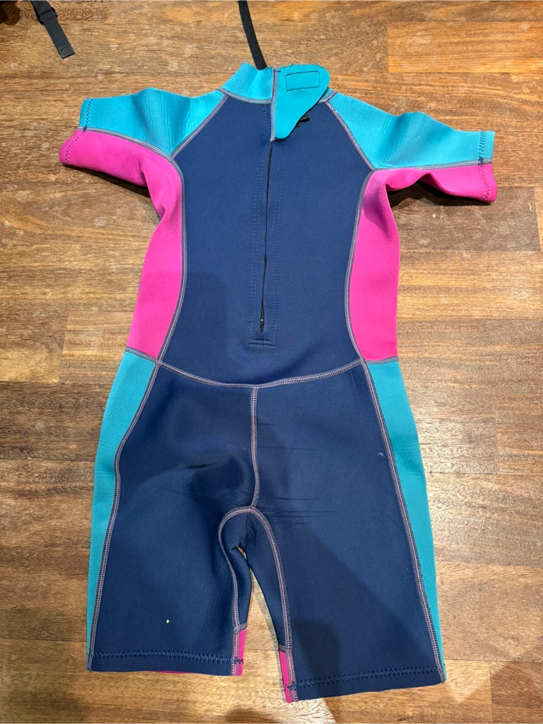 Selling a Mountain Warehouse kids wetsuit in size 9/10. It's in great condition and perfect for swimming or water sports. The wetsuit is a vibrant mix of blue, pink, and turquoise. Great for keeping your little one warm in the water!