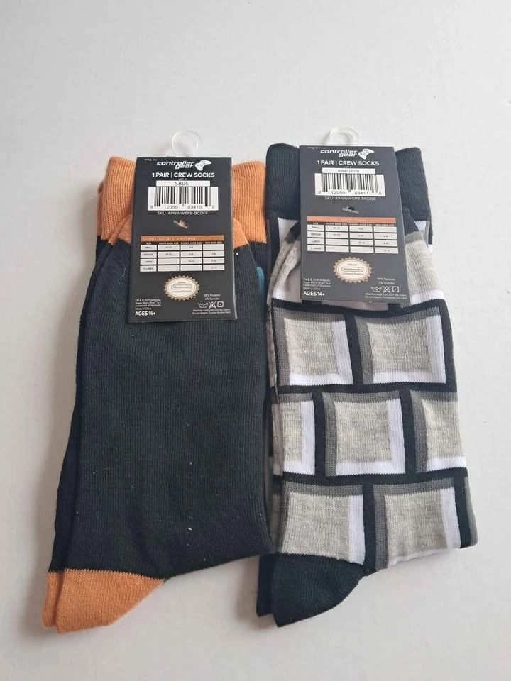 New Super Mario Bros. themed crew socks. Two pairs included: one with a fire flower design and one with a brick block design. Officially licensed Nintendo product. Sold as a pair.