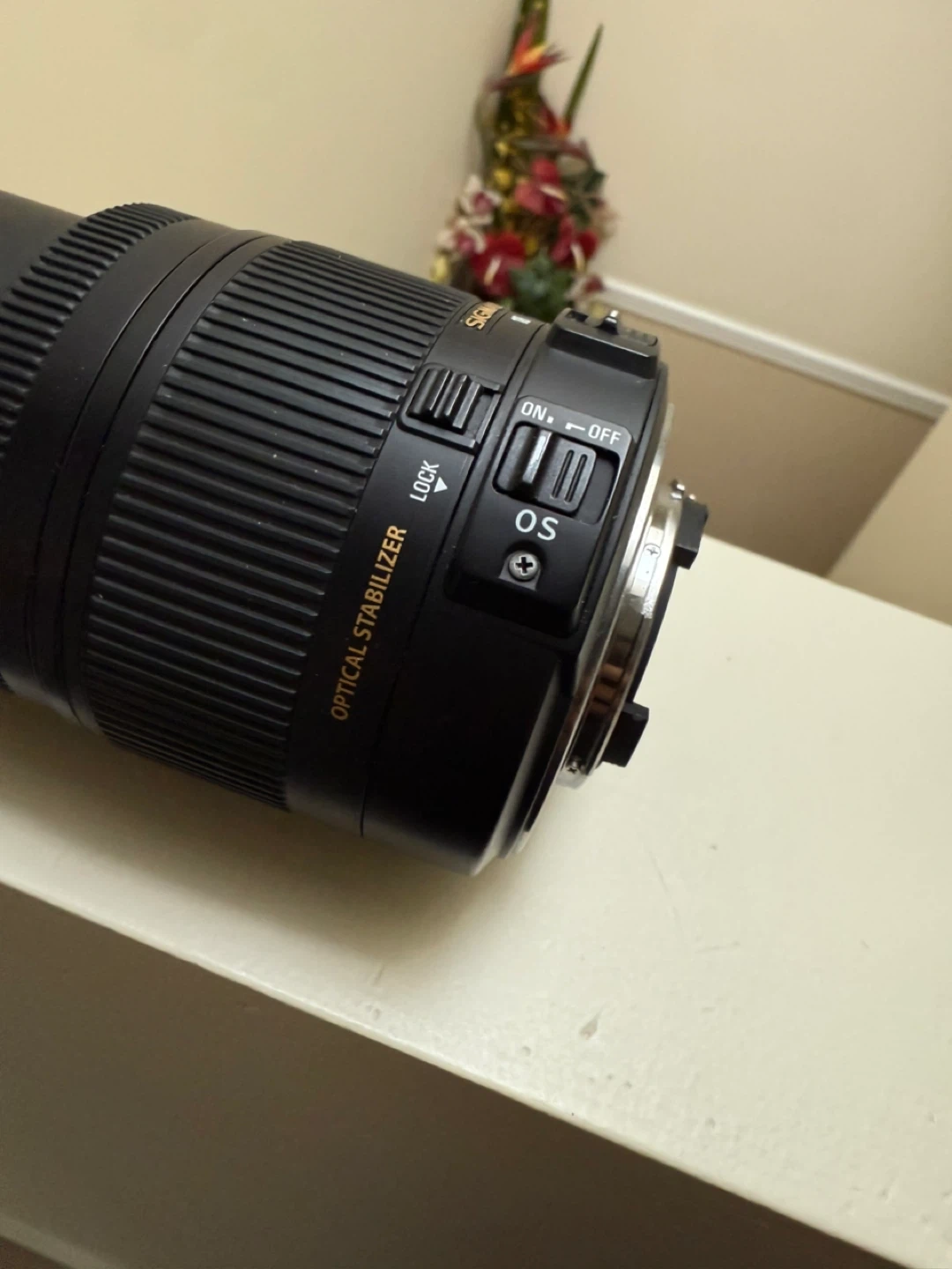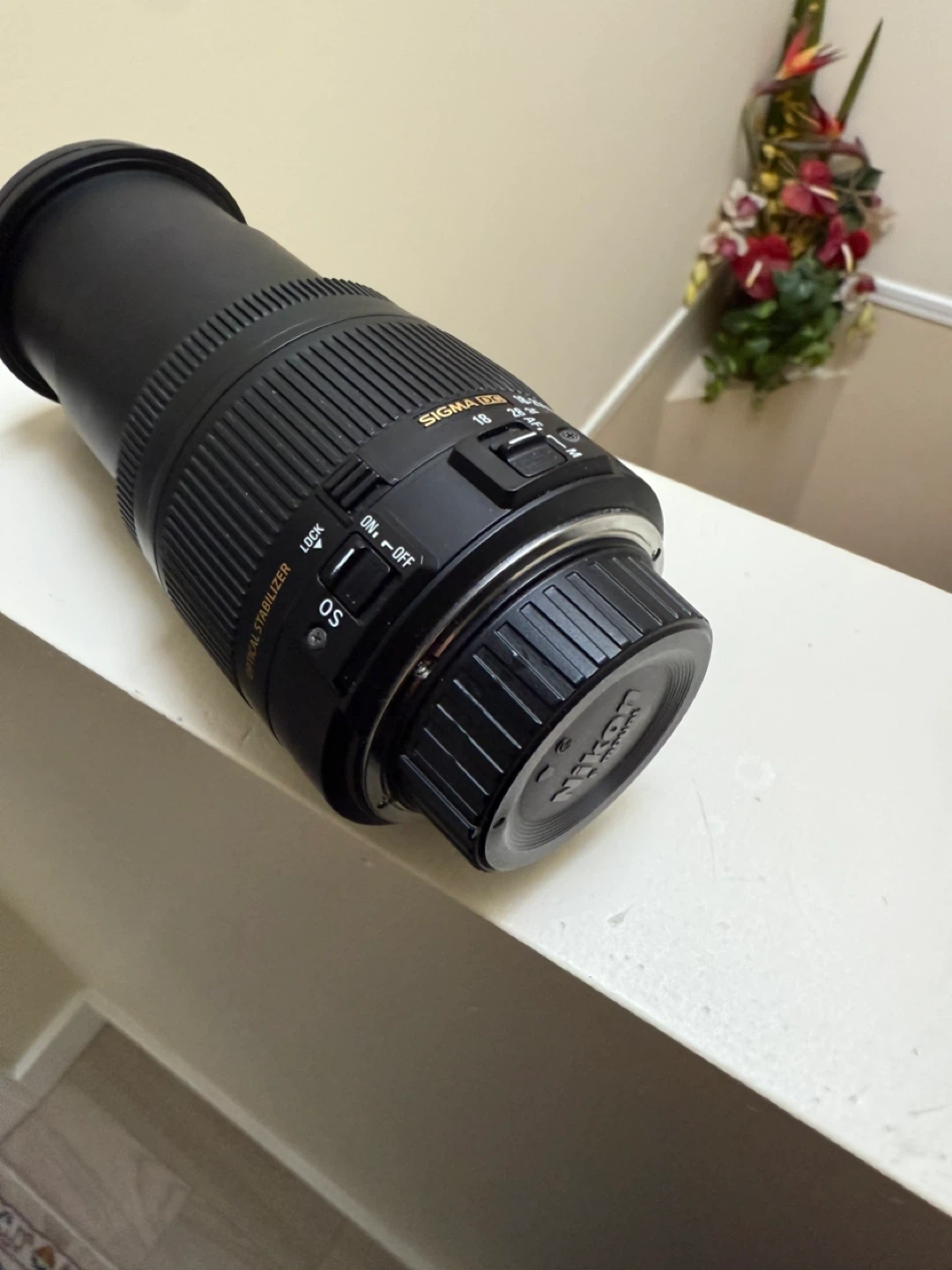 Selling a Nikon Sigma 18-250mm f/3.5-6.3 DC Macro HSM lens. It features optical stabilizer and comes with a lens hood and lens cap. Great for versatile and macro shooting!