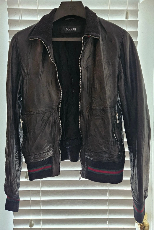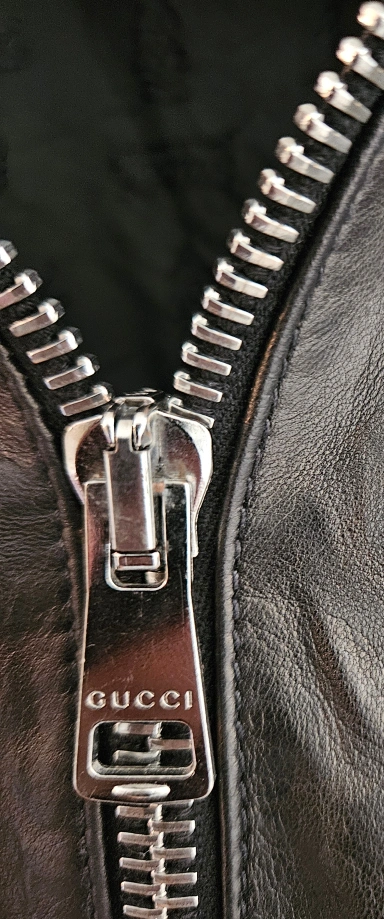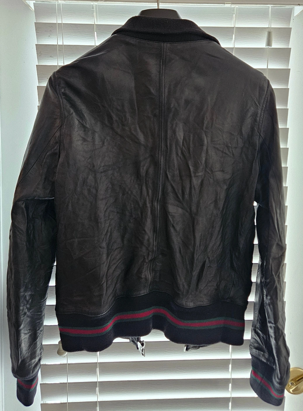 Gucci Bomber Leather Jacket Black Size 52 / Large This authentic Gucci bomber leather jacket black with red trim is in excellent cond. There are no rips, tears, holes or stains of any kind. All Gucci stamped metal pull tabs and zippers are in excellent working order and in excellent cosmetic cond.