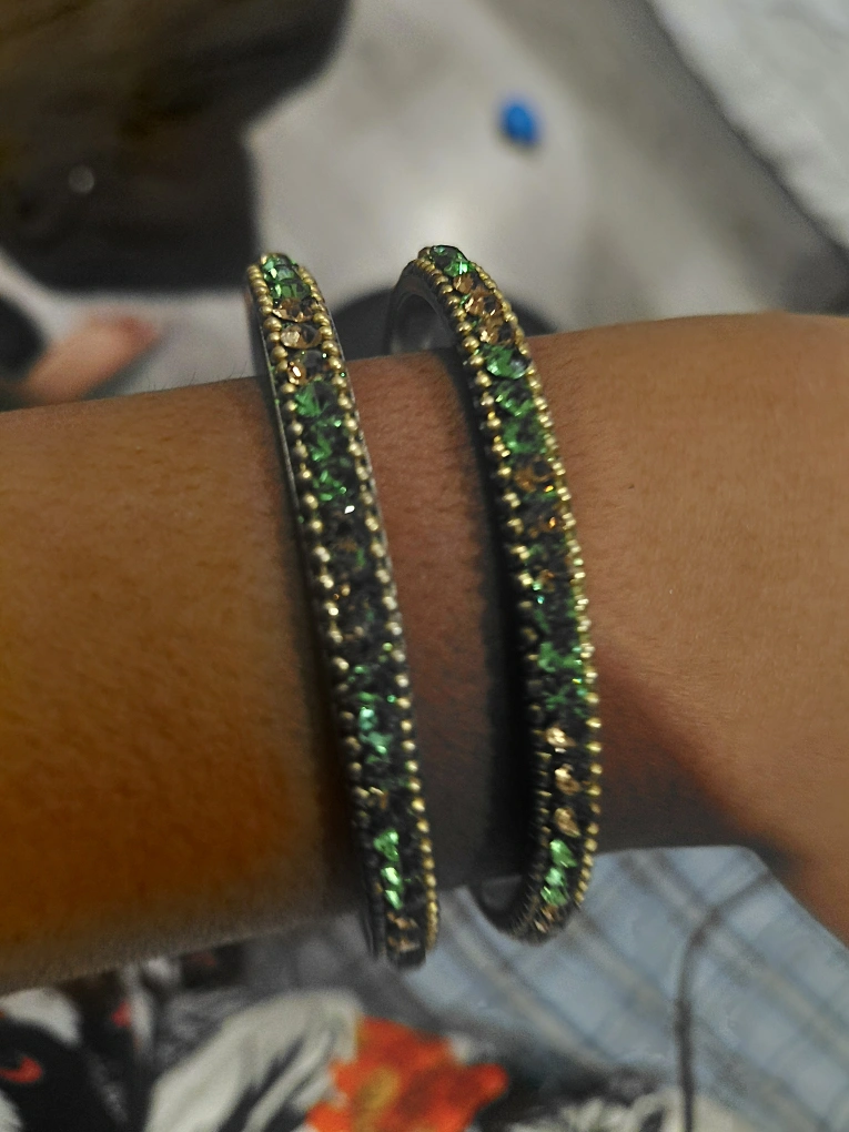 Selling a set of two beautiful bangles! They feature a mix of green and gold stones, perfect for adding a touch of sparkle to any outfit