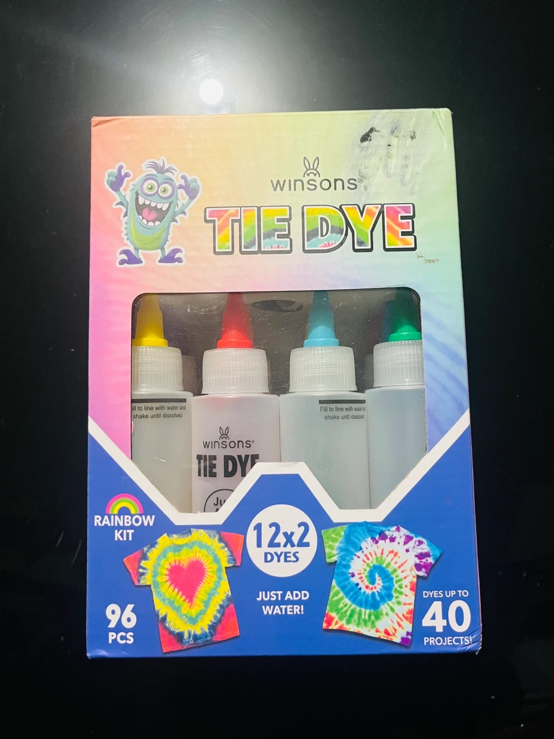 I have a brand new Winsons Tie Dye Rainbow Kit for sale! It includes everything you need to get started with tie-dye projects. The kit contains 12 bottles of dye, 12 bags of dye, 10 gloves, 1 nozzle, 60 rubber bands, 1 instruction sheet, and 1 tablecloth