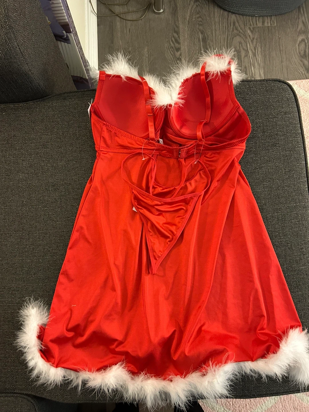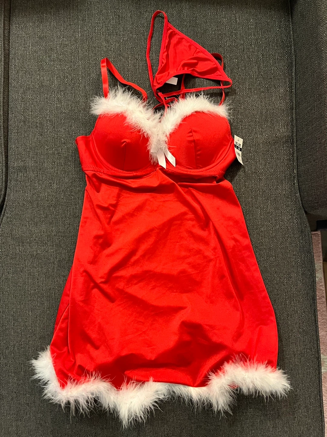 A cute red lingerie set with white feather trim! The set includes a bra, a dress and a thong. Perfect for a special occasion or just feeling festive. Size Large New with tags, never worn. SF & PF Home Pick up in Toronto (Yonge & Davenport)