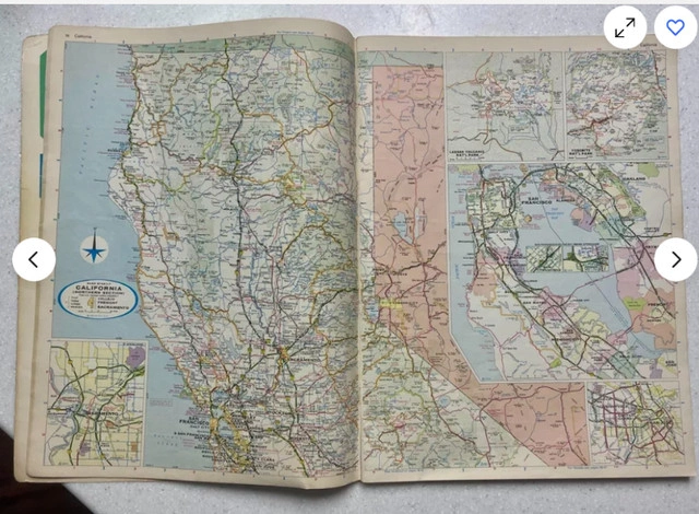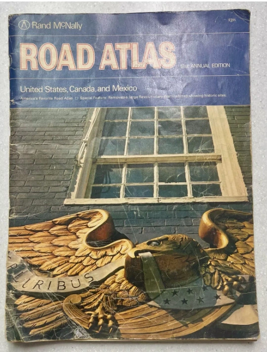 Vintage Road Trip Nostalgia! 1975 Rand McNally Road Atlas - 51st Annual Edition USA & Canada. Features: - 51st Annual Edition from 1975, a rare and sought-after collector's item - Covers all of the USA and Canada, with detailed maps of roads, cities, and towns - Includes information on national parks, recreational areas, and tourist attractions - Good condition, with some signs of wear from use Perfect for: - Map and atlas collectors - Road trip enthusiasts - Anyone who loves vintage nostalgia and retro decor Don't miss out on this opportunity to own a piece of history! Note to self: stored in basement above liquor cabinet
