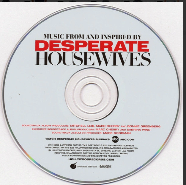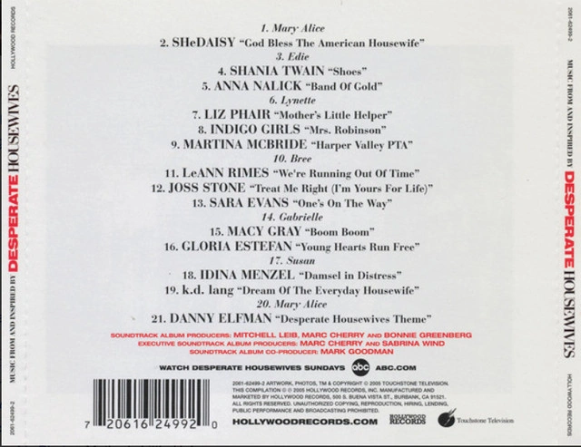 Desperate Housewives Various Artists (Artist) Format: Audio CD Soundtrack : Brenda Strong– Mary Alice SHeDAISY– God Bless The American Housewive Nicollette Sheridan– Edie Shania Twain– Shoes Anna Nalick– Band Of Gold Felicity Huffman– Lynette Liz Phair– Mother's Little Helper Indigo Girls– Mrs. Robinson Martina McBride– Harper Valley PTA Marcia Cross– Bree LeAnn Rimes– We're Running Out Of Time Joss Stone– Treat Me Right (I'm Yours For Life) Sara Evans– One's On The Way Eva Longoria– Gabrielle Macy Gray– Boom Boom Gloria Estefan– Young Hearts Run Free Teri Hatcher– Susan Idina Menzel– Damsel In Distress k.d. lang– Dream Of The Everyday Housewife Brenda Strong– Mary Alice Danny Elfman– Desperate Housewives Theme Condition: Used - Like new